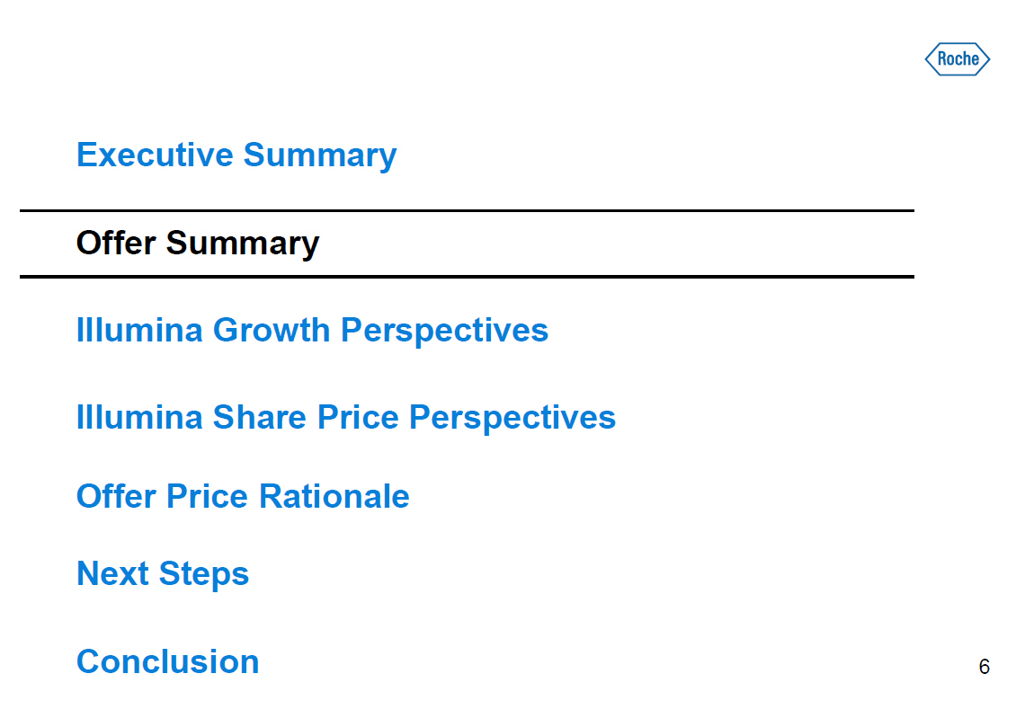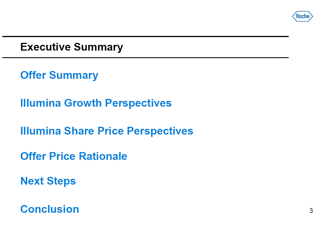 Executive Summary Offer Summary Illumina Growth Perspectives Illumina Share Price Perspectives Offer Price Rationale Next Steps Conclusion |