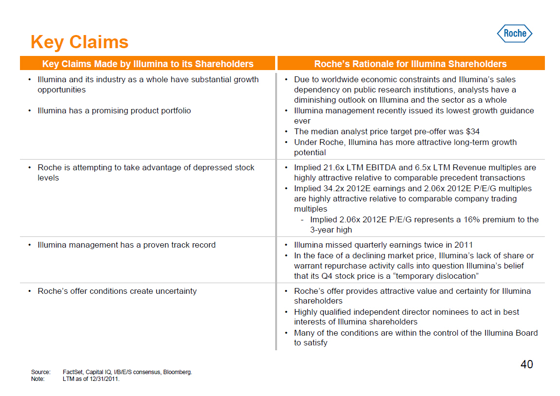 Roche's Offer Represents Value Certainty Amidst Significant Headwinds [] $51.00 all-cash offer provides attractive value today for Illumina shareholders -- Roche to hold all risk related to increasing competitive pressures and tightening fiscal policy related to government funding -- Removes execution risk around shift in customer and geographic focus [] Illumina has little experience in regulated areas such as diagnostics that require significant biological expertise as well as interactions with the FDA -- Not contingent on financing -- Roche stands ready, willing, and able to engage in substantive dialogue with Illumina [] Can move quickly through accelerated due diligence to reach a negotiated agreement [] Extensive team from Roche and its advisors ready to engage 38 |