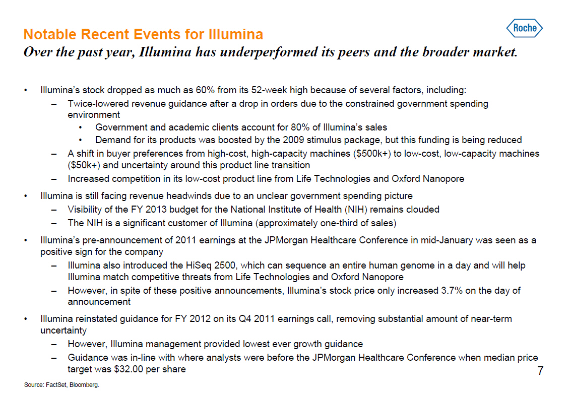 Notable Recent Events for Illumina Over the past year, Illumina has underperformed its peers and the broader market. [] Illumina's stock dropped as much as 60% from its 52-week high because of several factors, including: -- Twice-lowered revenue guidance after a drop in orders due to the constrained government spending environment [] Government and academic clients account for 80% of Illumina's sales [] Demand for its products was boosted by the 2009 stimulus package, but this funding is being reduced -- A shift in buyer preferences from high-cost, high-capacity machines ($500k+) to low-cost, low-capacity machines ($50k+) and uncertainty around this product line transition -- Increased competition in its low-cost product line from Life Technologies and Oxford Nanopore [] Illumina is still facing revenue headwinds due to an unclear government spending picture -- Visibility of the FY 2013 budget for the National Institute of Health (NIH) remains clouded -- The NIH is a significant customer of Illumina (approximately one-third of sales) [] Illumina's pre-announcement of 2011 earnings at the JPMorgan Healthcare Conference in mid-January was seen as a positive sign for the company -- Illumina also introduced the HiSeq 2500, which can sequence an entire human genome in a day and will help Illumina match competitive threats from Life Technologies and Oxford Nanopore -- However, in spite of these positive announcements, Illumina's stock price only increased 3.7% on the day of announcement [] Illumina reinstated guidance for FY 2012 on its Q4 2011 earnings call, removing substantial amount of near-term uncertainty -- However, Illumina management provided lowest ever growth guidance -- Guidance was in-line with where analysts were before the JPMorgan Healthcare Conference when median price target was $32.00 per share 7 Source: FactSet, Bloomberg. |