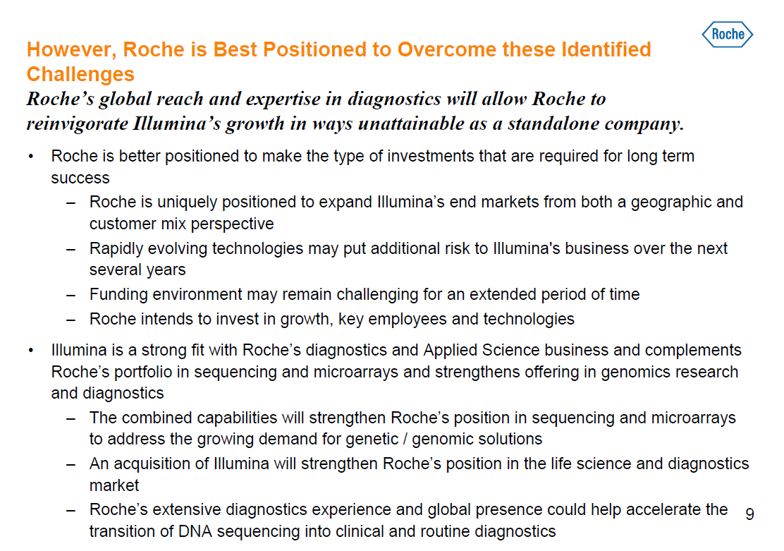 However, Roche is Best Positioned to Overcome these Identified Challenges Roche's global reach and expertise in diagnostics will allow Roche to reinvigorate Illumina's growth in ways unattainable as a standalone company. [] Roche is better positioned to make the type of investments that are required for long term success -- Roche is uniquely positioned to expand Illumina's end markets from both a geographic and customer mix perspective -- Rapidly evolving technologies may put additional risk to Illumina's business over the next several years -- Funding environment may remain challenging for an extended period of time -- Roche intends to invest in growth, key employees and technologies [] Illumina is a strong fit with Roche's diagnostics and Applied Science business and complements Roche's portfolio in sequencing and microarrays and strengthens offering in genomics research and diagnostics -- The combined capabilities will strengthen Roche's position in sequencing and microarrays to address the growing demand for genetic / genomic solutions -- An acquisition of Illumina will strengthen Roche's position in the life science and diagnostics market -- Roche's extensive diagnostics experience and global presence could help accelerate the 9 transition of DNA sequencing into clinical and routine diagnostics |