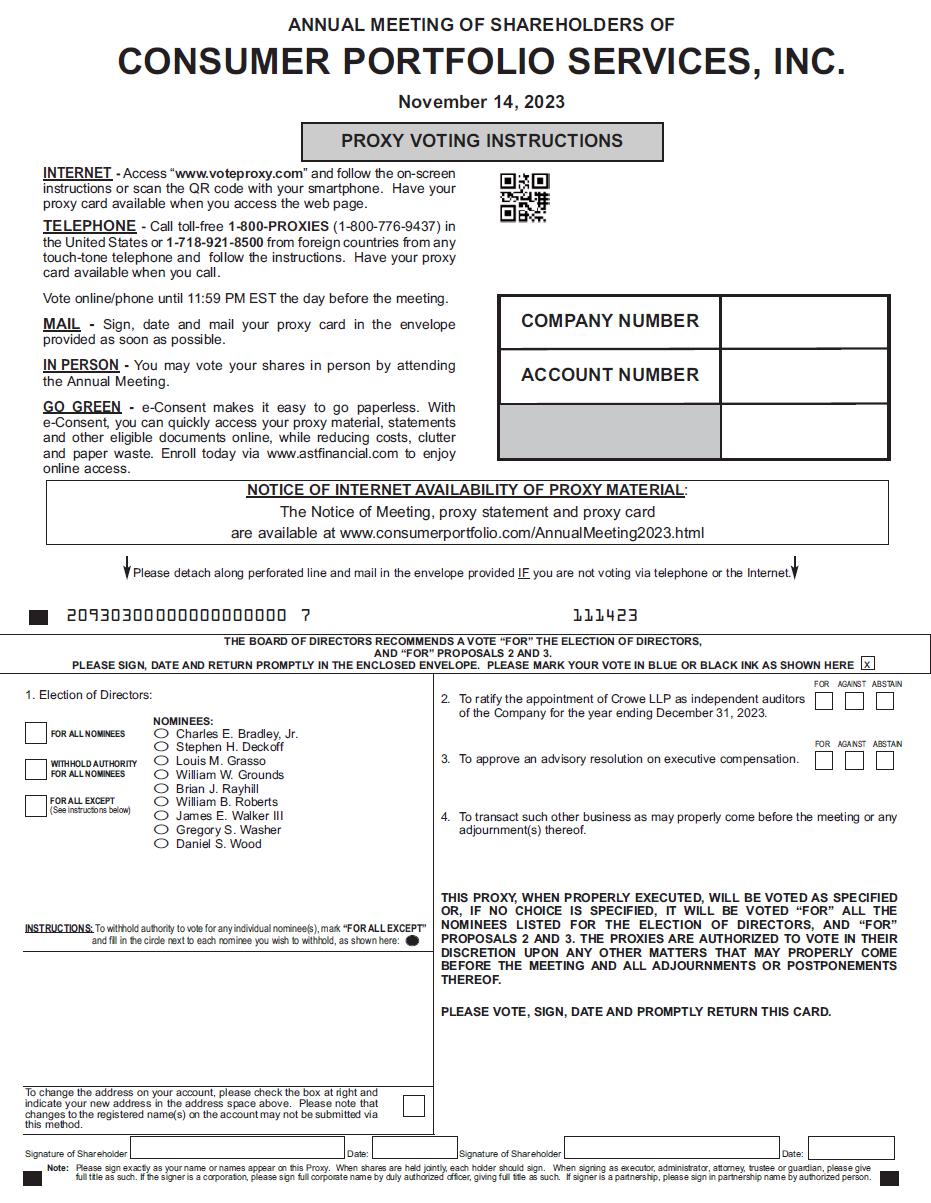 The Proxy Statement and Annual Report to Shareholders for the fiscal year ended December 31, 2022 are available at www.consumerportfolio.com/AnnualMeeting2023.html.