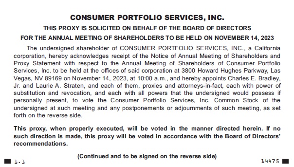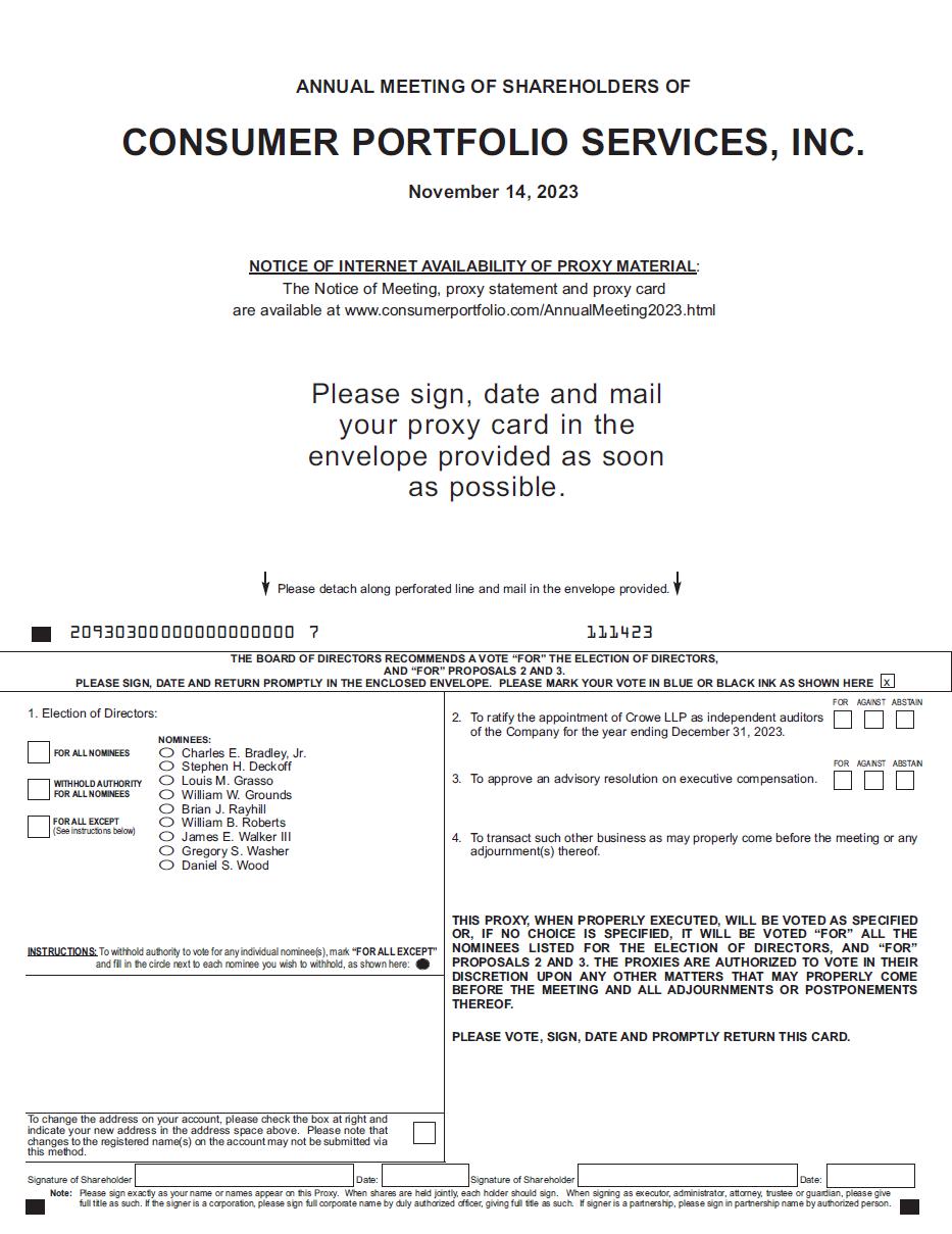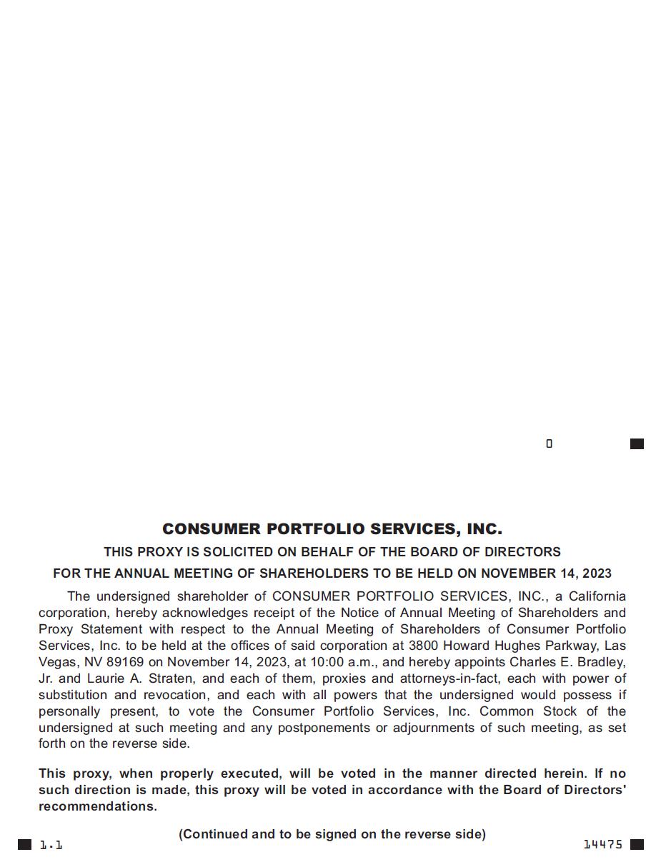 The annual meeting of the shareholders of Consumer Portfolio Services, Inc. (the “Company”) will be held at 10:00 a.m., local time, on Tuesday, November 14, 2023, at the Company’s Nevada office at 3800 Howard Hughes Parkway, Suite 1400, Las Vegas, Nevada 89169, for the following purposes: