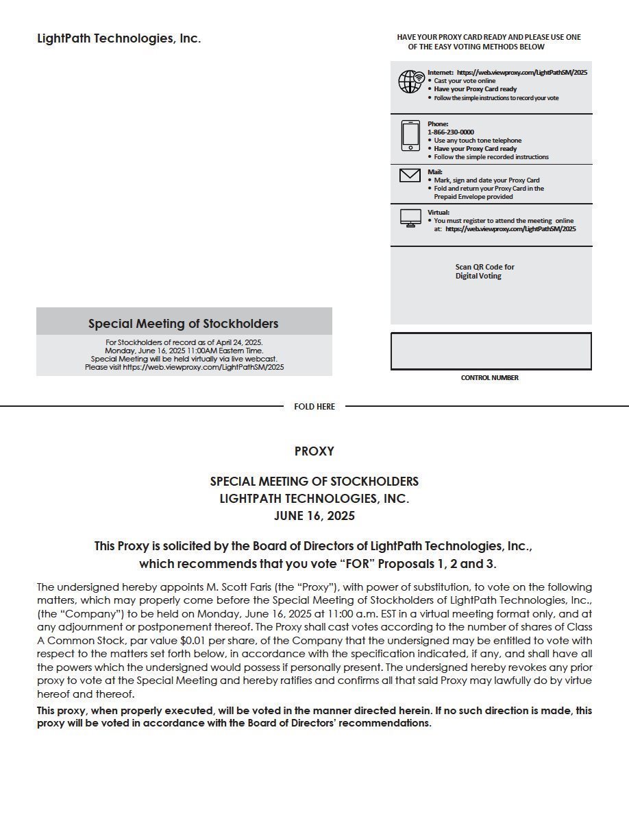 The undersigned hereby appoints each of M. Scott Faris and Shmuel Rubin as proxies and attorneys-in-fact (the “Proxies”), with power of substitution, to represent and vote all shares of LightPath Technologies, Inc. Class A Common Stock and Series G Preferred Stock which the undersigned is entitled to vote on all matters that may properly come before the Virtual Special Meeting of Stockholders of LightPath Technologies, Inc. to be held on Wednesday, June 16, 2025 at 11:00 a.m. EDT (the “Special Meeting”), or at any adjournment or postponement thereof.