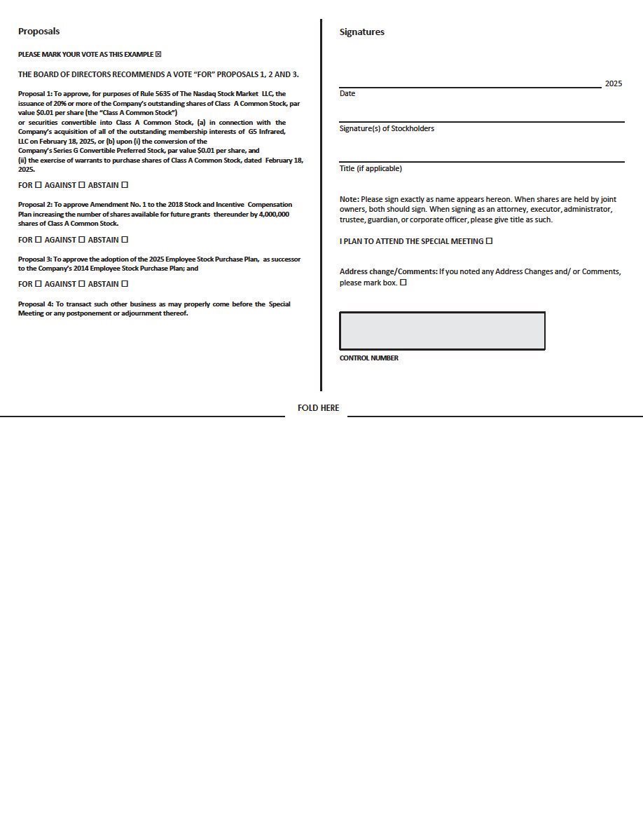 | 1. | To approve, for purposes of Rule 5635 of The Nasdaq Stock Market LLC, the issuance of 20% or more of the Company’s outstanding shares of Class A Common Stock, par value $0.01 per share (the “Class A Common Stock”) or securities convertible into Class A Common Stock, (a) in connection with the Company’s acquisition of all of the outstanding membership interests of G5 Infrared, LLC on February 18, 2025 (the “Acquisition”) or (b) upon (i) the conversion of the Company’s Series G Convertible Preferred Stock, par value $0.01 per share (the “Series G Preferred Stock”), and (ii) the exercise of warrants to purchase shares of Class A Common Stock (the “Warrants”), dated February 18, 2025; |