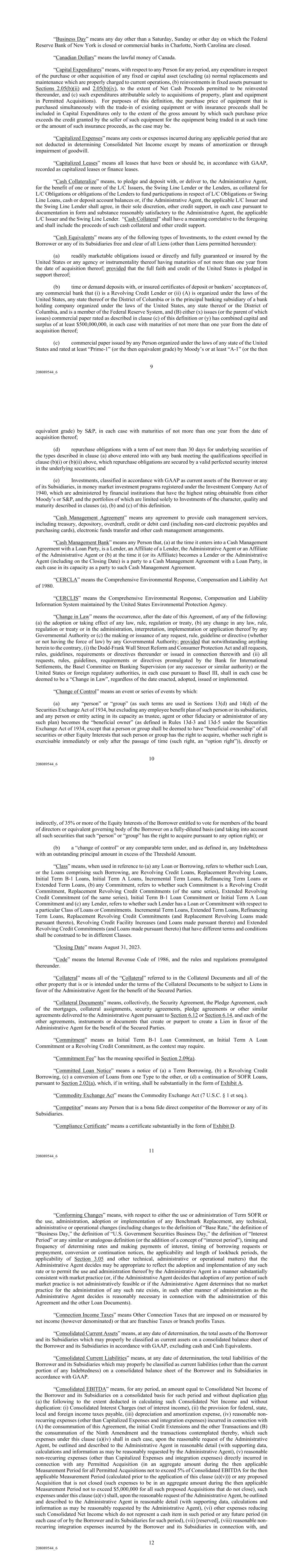 9 208089544_6 “Business Day” means any day other than a Saturday, Sunday or other day on which the Federal Reserve Bank of New York is closed or commercial banks in Charlotte, North Carolina are closed. “Canadian Dollars” means the lawful money of Canada. “Capital Expenditures” means, with respect to any Person for any period, any expenditure in respect of the purchase or other acquisition of any fixed or capital asset (excluding (a) normal replacements and maintenance which are properly charged to current operations, (b) reinvestments in fixed assets pursuant to Sections 2.05(b)(ii) and 2.05(b)(iv), to the extent of Net Cash Proceeds permitted to be reinvested thereunder, and (c) such expenditures attributable solely to acquisitions of property, plant and equipment in Permitted Acquisitions). For purposes of this definition, the purchase price of equipment that is purchased simultaneously with the trade-in of existing equipment or with insurance proceeds shall be included in Capital Expenditures only to the extent of the gross amount by which such purchase price exceeds the credit granted by the seller of such equipment for the equipment being traded in at such time or the amount of such insurance proceeds, as the case may be. “Capitalized Expenses” means any costs or expenses incurred during any applicable period that are not deducted in determining Consolidated Net Income except by means of amortization or through impairment of goodwill. “Capitalized Leases” means all leases that have been or should be, in accordance with GAAP, recorded as capitalized leases or finance leases. “Cash Collateralize” means, to pledge and deposit with, or deliver to, the Administrative Agent, for the benefit of one or more of the L/C Issuers, the Swing Line Lender or the Lenders, as collateral for L/C Obligations or obligations of the Lenders to fund participations in respect of L/C Obligations or Swing Line Loans, cash or deposit account balances or, if the Administrative Agent, the applicable L/C Issuer and the Swing Line Lender shall agree, in their sole discretion, other credit support, in each case pursuant to documentation in form and substance reasonably satisfactory to the Administrative Agent, the applicable L/C Issuer and the Swing Line Lender. “Cash Collateral” shall have a meaning correlative to the foregoing and shall include the proceeds of such cash collateral and other credit support. “Cash Equivalents” means any of the following types of Investments, to the extent owned by the Borrower or any of its Subsidiaries free and clear of all Liens (other than Liens permitted hereunder): (a) readily marketable obligations issued or directly and fully guaranteed or insured by the United States or any agency or instrumentality thereof having maturities of not more than one year from the date of acquisition thereof; provided that the full faith and credit of the United States is pledged in support thereof; (b) time or demand deposits with, or insured certificates of deposit or bankers’ acceptances of, any commercial bank that (i) is a Revolving Credit Lender or (ii) (A) is organized under the laws of the United States, any state thereof or the District of Columbia or is the principal banking subsidiary of a bank holding company organized under the laws of the United States, any state thereof or the District of Columbia, and is a member of the Federal Reserve System, and (B) either (x) issues (or the parent of which issues) commercial paper rated as described in clause (c) of this definition or (y) has combined capital and surplus of at least $500,000,000, in each case with maturities of not more than one year from the date of acquisition thereof; (c) commercial paper issued by any Person organized under the laws of any state of the United States and rated at least “Prime-1” (or the then equivalent grade) by Moody’s or at least “A-1” (or the then 10 208089544_6 equivalent grade) by S&P, in each case with maturities of not more than one year from the date of acquisition thereof; (d) repurchase obligations with a term of not more than 30 days for underlying securities of the types described in clause (a) above entered into with any bank meeting the qualifications specified in clause (b)(i) or (b)(ii) above, which repurchase obligations are secured by a valid perfected security interest in the underlying securities; and (e) Investments, classified in accordance with GAAP as current assets of the Borrower or any of its Subsidiaries, in money market investment programs registered under the Investment Company Act of 1940, which are administered by financial institutions that have the highest rating obtainable from either Moody’s or S&P, and the portfolios of which are limited solely to Investments of the character, quality and maturity described in clauses (a), (b) and (c) of this definition. “Cash Management Agreement” means any agreement to provide cash management services, including treasury, depository, overdraft, credit or debit card (including non-card electronic payables and purchasing cards), electronic funds transfer and other cash management arrangements. “Cash Management Bank” means any Person that, (a) at the time it enters into a Cash Management Agreement with a Loan Party, is a Lender, an Affiliate of a Lender, the Administrative Agent or an Affiliate of the Administrative Agent or (b) at the time it (or its Affiliate) becomes a Lender or the Administrative Agent (including on the Closing Date) is a party to a Cash Management Agreement with a Loan Party, in each case in its capacity as a party to such Cash Management Agreement. “CERCLA” means the Comprehensive Environmental Response, Compensation and Liability Act of 1980. “CERCLIS” means the Comprehensive Environmental Response, Compensation and Liability Information System maintained by the United States Environmental Protection Agency. “Change in Law” means the occurrence, af