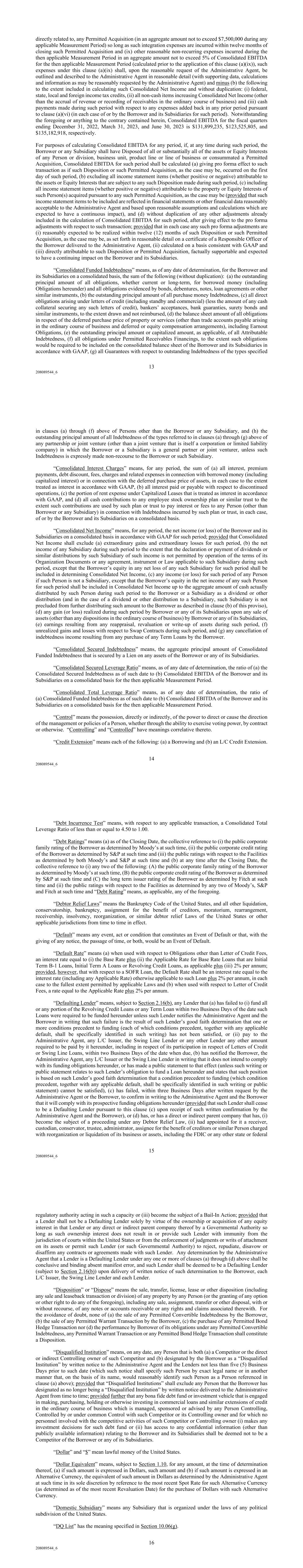 45 208089544_6 so long as such first preceding U.S. Government Securities Business Day is not more than three (3) U.S. Government Securities Business Days prior to such Base Rate Term SOFR Determination Day. “Term SOFR Adjustment” means a percentage equal to (a) 0.10% per annum with respect to the Revolving Credit Facility, (b) 0.00% per annum with respect to the Initial Term B-1 Facility and (c) 0.00% per annum with respect to the Initial Term A Facility. “Term SOFR Administrator” means CME Group Benchmark Administration Limited (CBA) (or a successor administrator of the Term SOFR Reference Rate selected by the Administrative Agent in its reasonable discretion). “Term SOFR Reference Rate” means the forward-looking term rate based on SOFR. “Threshold Amount” means $25,000,000. “Total Outstandings” means the aggregate Outstanding Amount of all Loans and all L/C Obligations. “Total Revolving Credit Outstandings” means the aggregate Outstanding Amount of all Revolving Credit Loans, Swing Line Loans and L/C Obligations. “Transactions” means, collectively, (a) the refinancing of certain indebtedness of the Borrower and its Subsidiaries and the extension and renewal of the Existing Credit Agreement, as contemplated by Section 4.01(l), (b) the entering into and funding on the Closing Date of the Initial Term B-1 Facility and the Revolving Credit Facility, and (c) the payment of fees, commissions, transaction costs and expenses incurred in connection with each of the foregoing. “Transformative Acquisition/Investment” means any Acquisition or Investment by the Borrower or any of its Subsidiaries that is (a) not permitted by the terms of the Loan Documents immediately prior to the consummation of such Acquisition or Investment or (b) if permitted by the terms of the Loan Documents immediately prior to the consummation of such Acquisition or Investment, the Loan Documents would not provide the Borrower and its Subsidiaries with adequate flexibility for the continuation and/or expansion of their combined operations following such consummation, as determined by the Borrower in good faith. “Type” means, with respect to a Loan, its character as a Base Rate Loan or a SOFR Loan. “UCC” means the Uniform Commercial Code as in effect in the State of New York; provided that, if perfection or the effect of perfection or non-perfection or the priority of any security interest in any Collateral is governed by the Uniform Commercial Code as in effect in a jurisdiction other than the State of New York, “UCC” means the Uniform Commercial Code as in effect from time to time in such other jurisdiction for purposes of the provisions hereof relating to such perfection, effect of perfection or non- perfection or priority. “UK Financial Institution” means any BRRD Undertaking (as such term is defined under the PRA Rulebook (as amended from time to time) promulgated by the United Kingdom Prudential Regulation Authority) or any person falling within IFPRU 11.6 of the FCA Handbook (as amended from time to time) promulgated by the United Kingdom Financial Conduct Authority, which includes certain credit institutions and investment firms, and certain affiliates of such credit institutions or investment firms. 46 208089544_6 “UK Resolution Authority” means the Bank of England or any other public administrative authority having responsibility for the resolution of any UK Financial Institution. “Unadjusted Benchmark Replacement” means the Benchmark Replacement excluding the Benchmark Replacement Adjustment. “Unfunded Pension Liability” means the excess of a Pension Plan’s benefit liabilities under Section 4001(a)(16) of ERISA, over the current value of that Pension Plan’s assets, determined in accordance with the assumptions used for funding the Pension Plan pursuant to Section 412 of the Code for the applicable plan year. “United States” and “U.S.” mean the United States of America. “Unreimbursed Amount” has the meaning specified in Section 2.03(c)(i). “U.S. Government Securities Business Day” means any day except for (a) a Saturday, (b) a Sunday or (c) a day on which the Securities Industry and Financial Markets Association recommends that the fixed income departments of its members be closed for the entire day for purposes of trading in United States government securities; provided, that for purposes of notice requirements in Sections 2.02 and 2.05, in each case, such day is also a Business Day. “U.S. Person” means any Person that is a “United States person” as defined in Section 7701(a)(30) of the Code. “U.S. Tax Compliance Certificate” has the meaning specified in Section 3.01(f). “Weighted Average Life to Maturity” means, when applied to any Indebtedness at any date, the number of years obtained by dividing: (a) the sum of the products obtained by multiplying (i) the amount of each then remaining installment, sinking fund, serial maturity or other required payments of principal, including payment at final maturity, in respect thereof, by (ii) the number of years (calculated to the nearest one-twelfth) that will elapse between such date and the making of such payment; by (b) the then outstanding principal amount of such Indebtedness. “Wells Fargo” means Wells Fargo Bank, National Association, a national banking association. “Wells Fargo Securities” means Wells Fargo Securities, LLC. “Withholding Agent” means any Loan Party and/or the Administrative Agent. “Write-Down and Conversion Powers” means (a) with respect to any EEA Resolution Authority, the write-down and conversion powers of such EEA Resolution Authority from time to time under the Bail- In Legislation for the applicable EEA Member Country, which write-down and conversion powers are described in the EU Bail-In Legislation Schedule and (b) with respect to the United Kingdom, any powers of the applicable Resolution Authority under the Bail-In Legislation t