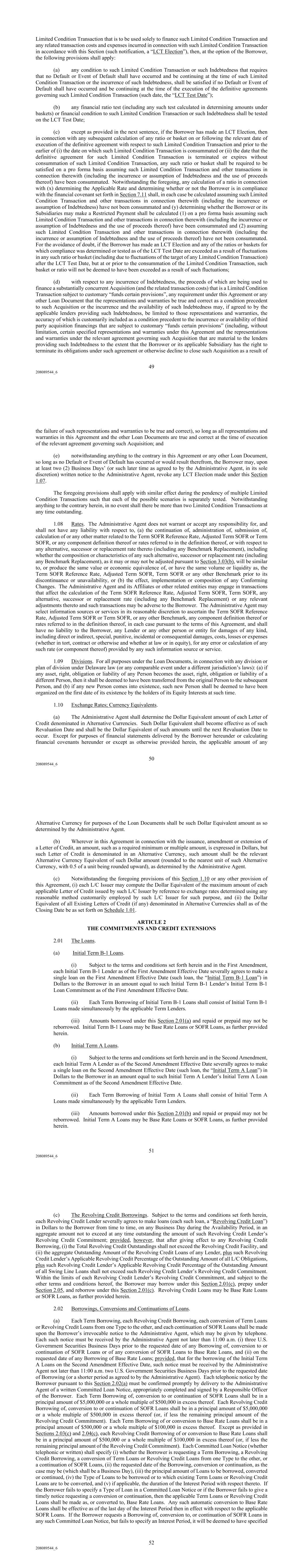 49 208089544_6 Limited Condition Transaction that is to be used solely to finance such Limited Condition Transaction and any related transaction costs and expenses incurred in connection with such Limited Condition Transaction in accordance with this Section (such notification, a “LCT Election”), then, at the option of the Borrower, the following provisions shall apply: (a) any condition to such Limited Condition Transaction or such Indebtedness that requires that no Default or Event of Default shall have occurred and be continuing at the time of such Limited Condition Transaction or the incurrence of such Indebtedness, shall be satisfied if no Default or Event of Default shall have occurred and be continuing at the time of the execution of the definitive agreements governing such Limited Condition Transaction (such date, the “LCT Test Date”); (b) any financial ratio test (including any such test calculated in determining amounts under baskets) or financial condition to such Limited Condition Transaction or such Indebtedness shall be tested on the LCT Test Date; (c) except as provided in the next sentence, if the Borrower has made an LCT Election, then in connection with any subsequent calculation of any ratio or basket on or following the relevant date of execution of the definitive agreement with respect to such Limited Condition Transaction and prior to the earlier of (i) the date on which such Limited Condition Transaction is consummated or (ii) the date that the definitive agreement for such Limited Condition Transaction is terminated or expires without consummation of such Limited Condition Transaction, any such ratio or basket shall be required to be satisfied on a pro forma basis assuming such Limited Condition Transaction and other transactions in connection therewith (including the incurrence or assumption of Indebtedness and the use of proceeds thereof) have been consummated. Notwithstanding the foregoing, any calculation of a ratio in connection with (x) determining the Applicable Rate and determining whether or not the Borrower is in compliance with the financial covenant set forth in Section 7.11 shall, in each case be calculated assuming such Limited Condition Transaction and other transactions in connection therewith (including the incurrence or assumption of Indebtedness) have not been consummated and (y) determining whether the Borrower or its Subsidiaries may make a Restricted Payment shall be calculated (1) on a pro forma basis assuming such Limited Condition Transaction and other transactions in connection therewith (including the incurrence or assumption of Indebtedness and the use of proceeds thereof) have been consummated and (2) assuming such Limited Condition Transaction and other transactions in connection therewith (including the incurrence or assumption of Indebtedness and the use of proceeds thereof) have not been consummated. For the avoidance of doubt, if the Borrower has made an LCT Election and any of the ratios or baskets for which compliance was determined or tested as of the LCT Test Date are exceeded as a result of fluctuations in any such ratio or basket (including due to fluctuations of the target of any Limited Condition Transaction) after the LCT Test Date, but at or prior to the consummation of the Limited Condition Transaction, such basket or ratio will not be deemed to have been exceeded as a result of such fluctuations; (d) with respect to any incurrence of Indebtedness, the proceeds of which are being used to finance a substantially concurrent Acquisition (and the related transaction costs) that is a Limited Condition Transaction subject to customary “funds certain provisions”, any requirement under this Agreement or any other Loan Document that the representations and warranties be true and correct as a condition precedent to such Acquisition or the incurrence and the availability of such Indebtedness may, if agreed to by the applicable lenders providing such Indebtedness, be limited to those representations and warranties, the accuracy of which is customarily included as a condition precedent to the incurrence or availability of third party acquisition financings that are subject to customary “funds certain provisions” (including, without limitation, certain specified representations and warranties under this Agreement and the representations and warranties under the relevant agreement governing such Acquisition that are material to the lenders providing such Indebtedness to the extent that the Borrower or its applicable Subsidiary has the right to terminate its obligations under such agreement or otherwise decline to close such Acquisition as a result of 50 208089544_6 the failure of such representations and warranties to be true and correct), so long as all representations and warranties in this Agreement and the other Loan Documents are true and correct at the time of execution of the relevant agreement governing such Acquisition; and (e) notwithstanding anything to the contrary in this Agreement or any other Loan Document, so long as no Default or Event of Default has occurred or would result therefrom, the Borrower may, upon at least two (2) Business Days’ (or such later time as agreed to by the Administrative Agent, in its sole discretion) written notice to the Administrative Agent, revoke any LCT Election made under this Section 1.07. The foregoing provisions shall apply with similar effect during the pendency of multiple Limited Condition Transactions such that each of the possible scenarios is separately tested. Notwithstanding anything to the contrary herein, in no event shall there be more than two Limited Condition Transactions at any time outstanding. 1.08 Rates. The Administrative Agent does not warrant or accept any responsibility for, and shall not have any liability with respect to, (a) the continuation of, administration of, submission of, calculation of or any other matter related to the Term SOFR Refer
