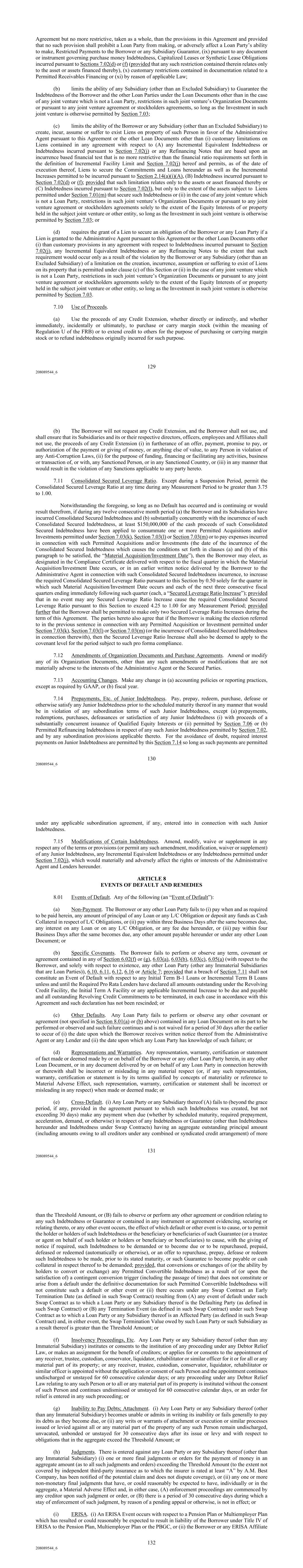 133 208089544_6 fails to pay when due, after the expiration of any applicable grace period, any installment payment with respect to its withdrawal liability under Section 4201 of ERISA under a Multiemployer Plan, in each case, that could reasonably be expected to result in a Material Adverse Effect; or (j) Invalidity of Loan Documents. Any provision of any Loan Document, at any time after its execution and delivery and for any reason other than as expressly permitted hereunder or thereunder or satisfaction in full of all the Obligations, ceases to be in full force and effect; or any Loan Party or any other Person contests in any manner the validity or enforceability of any provision of any Loan Document; or any Loan Party denies that it has any or further liability or obligation under any provision of any Loan Document, or purports to revoke, terminate or rescind any provision of any Loan Document; or (k) Change of Control. There occurs any Change of Control; or (l) Collateral Documents. Any Collateral Document after delivery thereof pursuant to Section 4.01 or Section 6.12 shall for any reason (other than pursuant to the terms thereof) cease to create a valid and perfected first priority Lien (subject to Liens permitted by Section 7.01) on the Collateral purported to be covered thereby, in each case other than in accordance with the express terms hereof or thereof or solely as a result of an action or inaction by the Administrative Agent. 8.02 Remedies upon Event of Default. If any Event of Default occurs and is continuing, the Administrative Agent shall, at the request of, or may, with the consent of, the Required Lenders (or if such Event of Default results solely from a breach of Section 7.11 that has not become an Event of Default with respect to the Initial Term B-1 Loans pursuant to Section 8.01(b), the Required Pro Rata Lenders), take any or all of the following actions: (a) declare the commitment of each Lender to make Loans and any obligation of each L/C Issuer to make L/C Credit Extensions to be terminated, whereupon such commitments and obligation shall be terminated; (b) declare the unpaid principal amount of all outstanding Loans, all interest accrued and unpaid thereon, and all other amounts owing or payable hereunder or under any other Loan Document (or, in the case the Required Pro Rata Lenders are taking such action, only the Loans and Obligations under the Revolving Credit Facility, the Initial Term A Facility and any applicable Incremental Increase) to be immediately due and payable, without presentment, demand, protest or other notice of any kind, all of which are hereby expressly waived by the Borrower; (c) require that the Borrower Cash Collateralize the L/C Obligations (in an amount equal to the Minimum Collateral Amount with respect thereto); and (d) exercise on behalf of itself, the Lenders and the L/C Issuers all rights and remedies available to it, the Lenders and the L/C Issuers under the Loan Documents or applicable law; provided, however, that upon the occurrence of an actual or deemed entry of an order for relief with respect to the Borrower under the Bankruptcy Code of the United States, the obligation of each Lender to make Loans and any obligation of each L/C Issuer to make L/C Credit Extensions shall automatically terminate, the unpaid principal amount of all outstanding Loans and all interest and other amounts as aforesaid shall automatically become due and payable, and the obligation of the Borrower to Cash Collateralize the L/C Obligations as aforesaid shall automatically become effective, in each case without further act of the Administrative Agent or any Lender. 134 208089544_6 8.03 Application of Funds. After the exercise of remedies provided for in Section 8.02 (or after the Loans have automatically become immediately due and payable and the L/C Obligations have automatically been required to be Cash Collateralized as set forth in the proviso to Section 8.02), any amounts received on account of the Secured Obligations shall, subject to the provisions of Section 2.15 and 2.16, be applied by the Administrative Agent in the following order: First, to payment of that portion of the Secured Obligations constituting fees, indemnities, expenses and other amounts (including fees, charges and disbursements of counsel to the Administrative Agent and amounts payable under Article 3) payable to the Administrative Agent in its capacity as such; Second, to payment of that portion of the Secured Obligations constituting fees, indemnities and other amounts (other than principal, interest and Letter of Credit Fees) payable to the Lenders and the L/C Issuers (including fees, charges and disbursements of counsel to the respective Lenders and the L/C Issuers arising under the Loan Documents and amounts payable under Article 3), ratably among them in proportion to the respective amounts described in this clause Second payable to them; Third, to payment of that portion of the Secured Obligations constituting accrued and unpaid Letter of Credit Fees and interest on the Loans, L/C Borrowings and other Secured Obligations arising under the Loan Documents, ratably among the Lenders and the L/C Issuers in proportion to the respective amounts described in this clause Third payable to them; Fourth, to payment of that portion of the Secured Obligations constituting unpaid principal of the Loans, L/C Borrowings and Secured Obligations then owing under Secured Hedge Agreements and Secured Cash Management Agreements, ratably among the Lenders, the L/C Issuers, the Hedge Banks and the Cash Management Banks in proportion to the respective amounts described in this clause Fourth held by them; Fifth, to the Administrative Agent for the account of the applicable L/C Issuer, to Cash Collateralize that portion of L/C Obligations comprised of the aggregate undrawn amount of Letters of Credit issued by such L/C Issuer to the extent not otherwise Cash Collateralized by the Borrower pursu