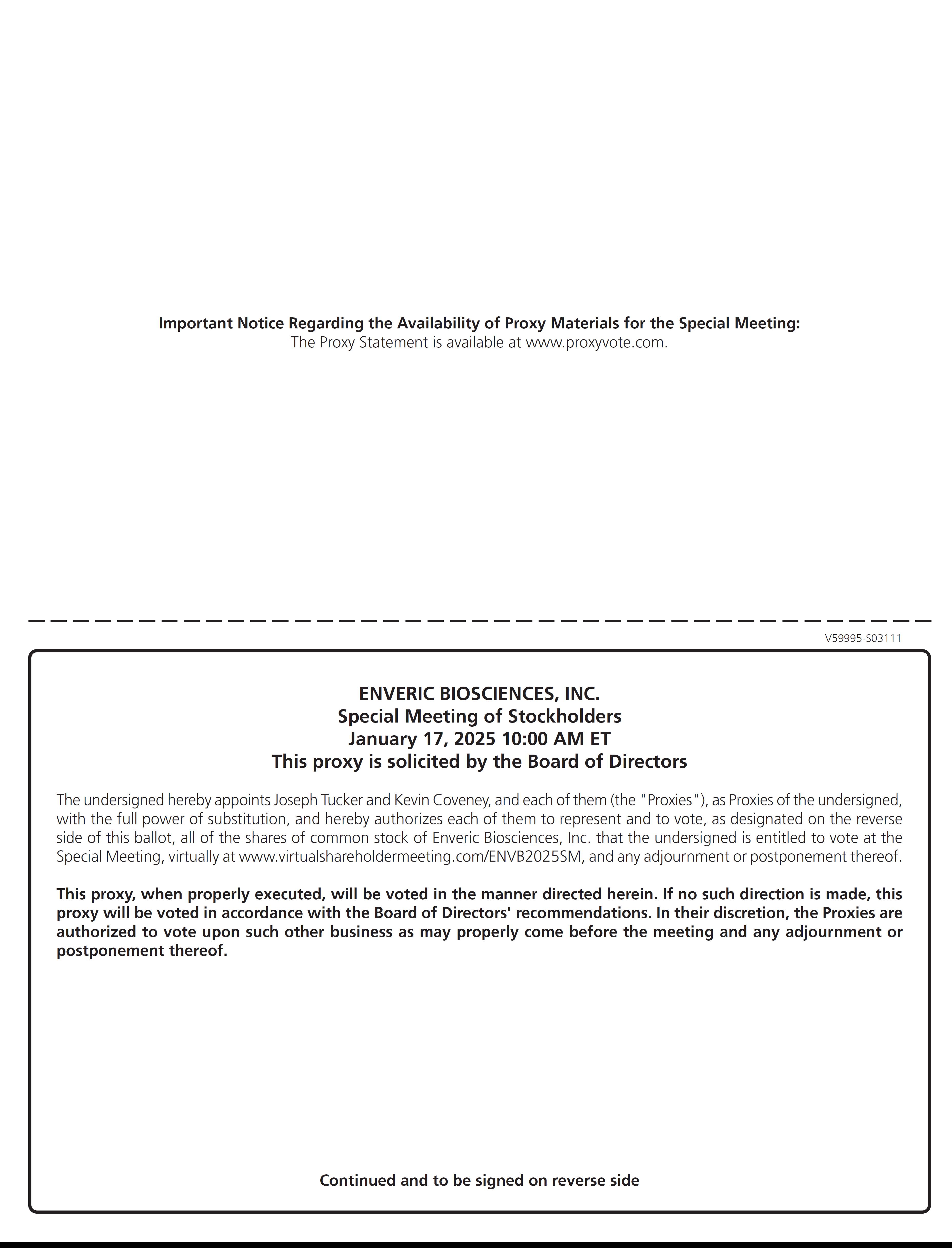 Notice is hereby given that a special meeting of the stockholders (the “Special Meeting”) of Enveric Biosciences, Inc., a Delaware corporation (the “Company”), will be held on January 17, 2025 at 10:00 a.m. Eastern time via a live webcast on the Internet. You will be able to virtually attend the Special Meeting online, vote and submit questions during the Special Meeting by visiting www.virtualshareholdermeeting.com/ENVB2025SM during the meeting. We are holding the Special Meeting for the following purposes, which are more fully described in the accompanying proxy statement: