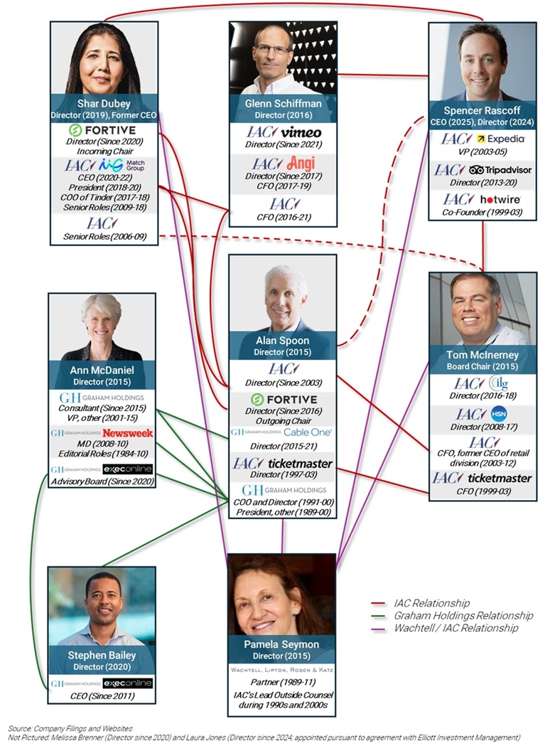 The Board’s composition comprises of primarily long-tenured directors with direct interlockings and deep ties to IAC, including former CEO Shar Dubey despite her being vastly overpaid for incredibly poor execution and a significant capital allocation blunder while she was CEO under the Board’s watch. We have summarized the staggering, decades-long interlockings of Match directors below, which we believe clearly visualizes the utter lack of independence and accountability at Match.