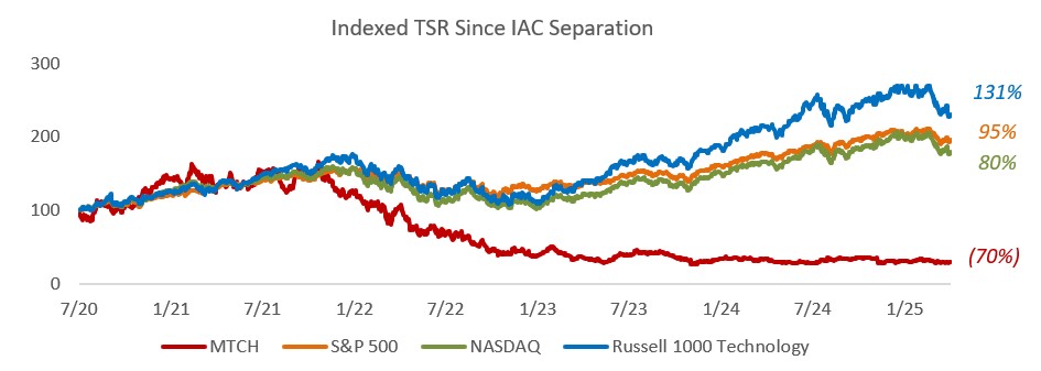 Over the course of our years-long engagement with the Company and its Board of Directors (the “Board”), it has become clear to us that the Company’s long-term underperformance was a symptom of poor corporate governance and Board oversight. In other words, we believe Match’s outdated, insular Board with deep interlockings is inadequately qualified to oversee a modern technology company primarily serving young adults. As Match’s struggles persist, the Board’s only solution has seemingly been to blame the CEO, choosing to play musical chairs with the role instead of addressing the core issue at hand. Four CEO changes in the past five years have prevented any continuity in terms of strategy, caused chaos in the leadership ranks and perpetuated subpar execution, which in turn has led to tremendous value destruction. As shown below, since separating from the Company’s former parent IAC Inc. (InterActiveCorp), in July 2020, Match’s shares have declined nearly 70%, while broader market indices have soared.