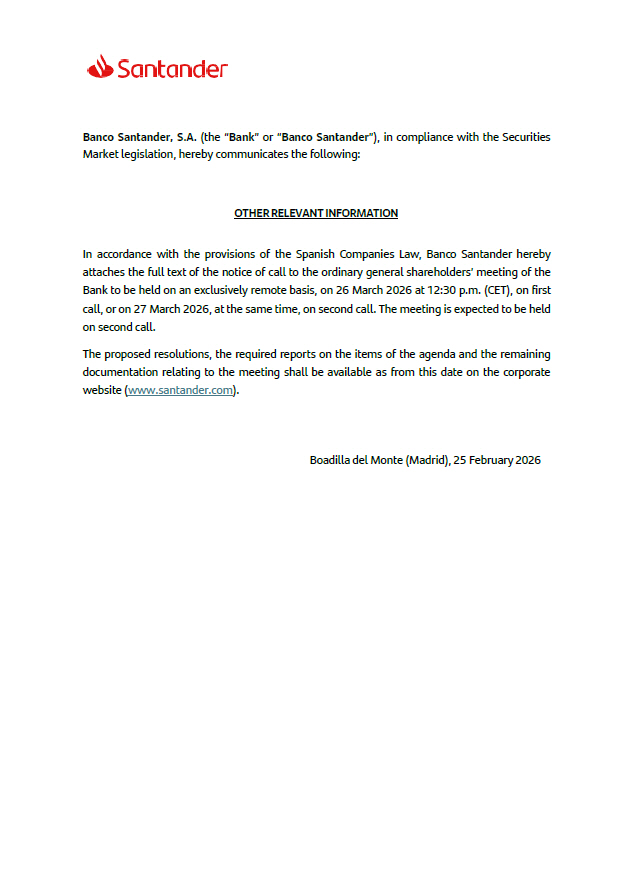 Banco Santander, S.A. (the “ Bank ” or “ Banco Santander ”), in compliance with the Securities Market legislation, hereby communicates the following: OTHER RELEVANT INFORMATION In accordance with the provisions of the Spanish Companies Law, Banco Santander hereby attaches the full text of the notice of call to the ordinary general shareholders’ meeting of the Bank to be held on an exclusively remote basis, on 26 March 2026 at 12 : 30 p . m . (CET), on first call, or on 27 March 2026 , at the same time, on second call . The meeting is expected to be held on second call . The proposed resolutions, the required reports on the items of the agenda and the remaining documentation relating to the meeting shall be available as from this date on the corporate website ( www . santander . com ) . Boadilla del Monte (Madrid), 25 February 2026