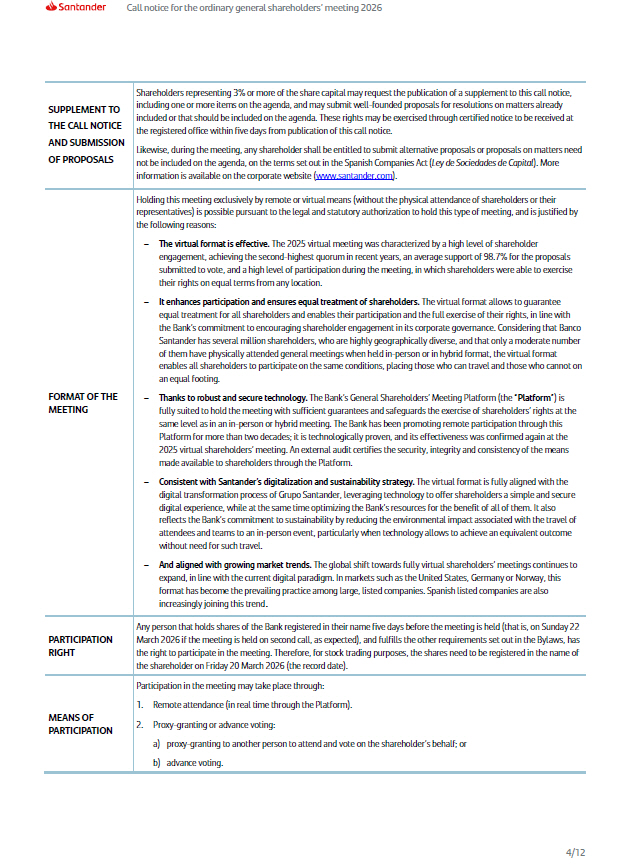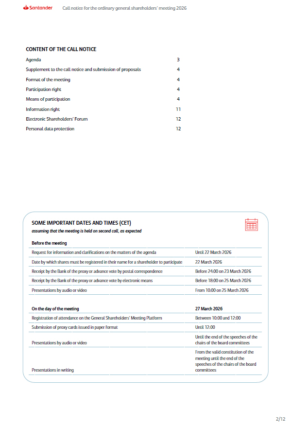 Call notice for the ordinary general shareholders’ meeting 2026 Shareholders representing 3% or more of the share capital may request the publication of a supplement to this call notice, including one or more items on the agenda, and may submit well - founded proposals for resolutions on matters already included or that should be included on the agenda. These rights may be exercised through certified notice to be received at the registered office within five days from publication of this call notice. Likewise, during the meeting, any shareholder shall be entitled to submit alternative proposals or proposals on matters need not be included on the agenda, on the terms set out in the Spanish Companies Act ( Ley de Sociedades de Capital ). More information is available on the corporate website ( www.santander.com ). SUPPLEMENT TO THE CALL NOTICE AND SUBMISSION OF PROPOSALS Holding this meeting exclusively by remote or virtual means (without the physical attendance of shareholders or their representatives) is possible pursuant to the legal and statutory authorization to hold this type of meeting, and is justified by the following reasons: – The virtual format is effective. The 2025 virtual meeting was characterized by a high level of shareholder engagement, achieving the second - highest quorum in recent years, an average support of 98.7% for the proposals submitted to vote, and a high level of participation during the meeting, in which shareholders were able to exercise their rights on equal terms from any location. – It enhances participation and ensures equal treatment of shareholders. The virtual format allows to guarantee equal treatment for all shareholders and enables their participation and the full exercise of their rights, in line with the Bank’s commitment to encouraging shareholder engagement in its corporate governance. Considering that Banco Santander has several million shareholders, who are highly geographically diverse, and that only a moderate number of them have physically attended general meetings when held in - person or in hybrid format, the virtual format enables all shareholders to participate on the same conditions, placing those who can travel and those who cannot on an equal footing. – Thanks to robust and secure technology. The Bank’s General Shareholders’ Meeting Platform (the “ Platform ”) is fully suited to hold the meeting with sufficient guarantees and safeguards the exercise of shareholders’ rights at the same level as in an in - person or hybrid meeting. The Bank has been promoting remote participation through this Platform for more than two decades; it is technologically proven, and its effectiveness was confirmed again at the 2025 virtual shareholders’ meeting. An external audit certifies the security, integrity and consistency of the means made available to shareholders through the Platform. – Consistent with Santander’s digitalization and sustainability strategy. The virtual format is fully aligned with the digital transformation process of Grupo Santander, leveraging technology to offer shareholders a simple and secure digital experience, while at the same time optimizing the Bank’s resources for the benefit of all of them. It also reflects the Bank’s commitment to sustainability by reducing the environmental impact associated with the travel of attendees and teams to an in - person event, particularly when technology allows to achieve an equivalent outcome without need for such travel. – And aligned with growing market trends. The global shift towards fully virtual shareholders’ meetings continues to expand, in line with the current digital paradigm. In markets such as the United States, Germany or Norway, this format has become the prevailing practice among large, listed companies. Spanish listed companies are also increasingly joining this trend . FORMAT OF THE MEETING Any person that holds shares of the Bank registered in their name five days before the meeting is held (that is, on Sunday 22 March 2026 if the meeting is held on second call, as expected), and fulfills the other requirements set out in the Bylaws, has the right to participate in the meeting . Therefore, for stock trading purposes, the shares need to be registered in the name of the shareholder on Friday 20 March 2026 (the record date) . PARTICIPATION RIGHT Participation in the meeting may take place through: 1. Remote attendance (in real time through the Platform). 2. Proxy - granting or advance voting: a) proxy - granting to another person to attend and vote on the shareholder’s behalf; or b) advance voting. MEANS OF PARTICIPATION 4/12