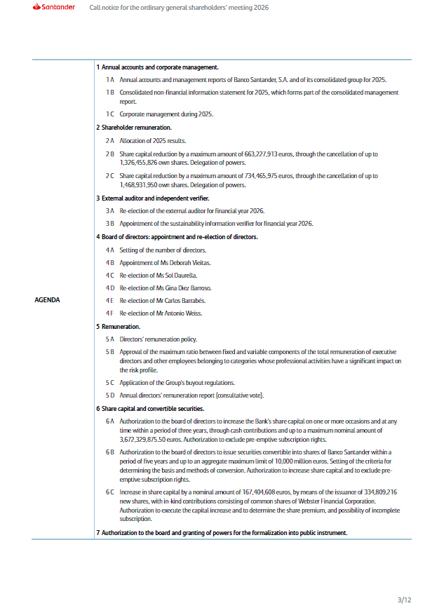 Call notice for the ordinary general shareholders’ meeting 2026 AGENDA 3/12 1 Annual accounts and corporate management. 1 A Annual accounts and management reports of Banco Santander, S.A. and of its consolidated group for 2025. 1 B Consolidated non - financial information statement for 2025, which forms part of the consolidated management report. 1 C Corporate management during 2025. 2 Shareholder remuneration. 2 A Allocation of 2025 results. 2 B Share capital reduction by a maximum amount of 663,227,913 euros, through the cancellation of up to 1,326,455,826 own shares. Delegation of powers. 2 C Share capital reduction by a maximum amount of 734,465,975 euros, through the cancellation of up to 1,468,931,950 own shares. Delegation of powers. 3 External auditor and independent verifier. 3 A Re - election of the external auditor for financial year 2026. 3 B Appointment of the sustainability information verifier for financial year 2026. 4 Board of directors: appointment and re - election of directors. 4 A Setting of the number of directors. 4 B Appointment of Ms Deborah Vieitas. 4 C Re - election of Ms Sol Daurella. 4 D Re - election of Ms Gina Díez Barroso. 4 E Re - election of Mr Carlos Barrabés. 4 F Re - election of Mr Antonio Weiss. 5 Remuneration. 5 A Directors’ remuneration policy. 5 B Approval of the maximum ratio between fixed and variable components of the total remuneration of executive directors and other employees belonging to categories whose professional activities have a significant impact on the risk profile. 5 C Application of the Group’s buyout regulations. 5 D Annual directors’ remuneration report (consultative vote). 6 Share capital and convertible securities. 6 A Authorization to the board of directors to increase the Bank’s share capital on one or more occasions and at any time within a period of three years, through cash contributions and up to a maximum nominal amount of 3,672,329,875.50 euros. Authorization to exclude pre - emptive subscription rights. 6 B Authorization to the board of directors to issue securities convertible into shares of Banco Santander within a period of five years and up to an aggregate maximum limit of 10 , 000 million euros . Setting of the criteria for determining the basis and methods of conversion . Authorization to increase share capital and to exclude pre - emptive subscription rights . 6 C Increase in share capital by a nominal amount of 167 , 404 , 608 euros, by means of the issuance of 334 , 809 , 216 new shares, with in - kind contributions consisting of common shares of Webster Financial Corporation . Authorization to execute the capital increase and to determine the share premium, and possibility of incomplete subscription . 7 Authorization to the board and granting of powers for the formalization into public instrument.