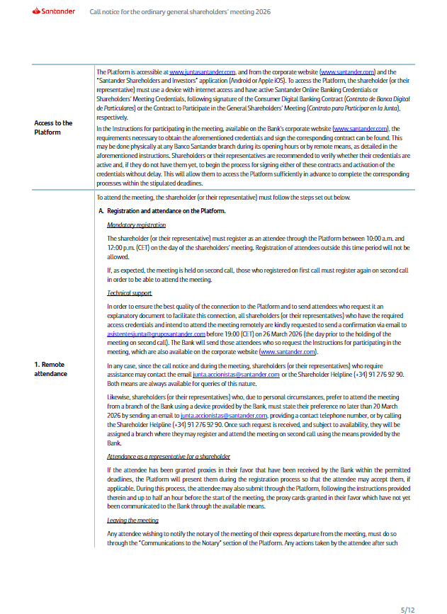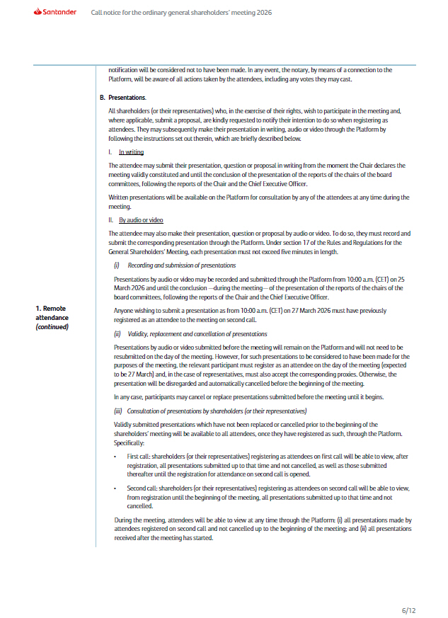 Call notice for the ordinary general shareholders’ meeting 2026 Access to the Platform 5/12 1. Remote attendance The Platform is accessible at www.juntasantander.com , and from the corporate website ( www.santander.com ) and the “Santander Shareholders and Investors” application (Android or Apple iOS). To access the Platform, the shareholder (or their representative) must use a device with internet access and have active Santander Online Banking Credentials or Shareholders’ Meeting Credentials, following signature of the Consumer Digital Banking Contract ( Contrato de Banca Digital de Particulares ) or the Contract to Participate in the General Shareholders’ Meeting ( Contrato para Participar en la Junta ), respectively. In the Instructions for participating in the meeting, available on the Bank's corporate website ( www.santander.com ) , the requirements necessary to obtain the aforementioned credentials and sign the corresponding contract can be found. This may be done physically at any Banco Santander branch during its opening hours or by remote means, as detailed in the aforementioned instructions. Shareholders or their representatives are recommended to verify whether their credentials are active and, if they do not have them yet, to begin the process for signing either of these contracts and activation of the credentials without delay. This will allow them to access the Platform sufficiently in advance to complete the corresponding processes within the stipulated deadlines. To attend the meeting, the shareholder (or their representative) must follow the steps set out below. A. Registration and attendance on the Platform. Mandatory registration The shareholder (or their representative) must register as an attendee through the Platform between 10:00 a.m. and 12:00 p.m. (CET) on the day of the shareholders’ meeting. Registration of attendees outside this time period will not be allowed. If, as expected, the meeting is held on second call, those who registered on first call must register again on second call in order to be able to attend the meeting. Technical support In order to ensure the best quality of the connection to the Platform and to send attendees who request it an explanatory document to facilitate this connection, all shareholders (or their representatives) who have the required access credentials and intend to attend the meeting remotely are kindly requested to send a confirmation via email to asistentesjunta@gruposantander.com before 19:00 (CET) on 26 March 2026 (the day prior to the holding of the meeting on second call). The Bank will send those attendees who so request the Instructions for participating in the meeting, which are also available on the corporate website ( www.santander.com ). In any case, since the call notice and during the meeting, shareholders (or their representatives) who require assistance may contact the email junta.accionistas@santander.com or the Shareholder Helpline (+34) 91 276 92 90. Both means are always available for queries of this nature. Likewise, shareholders (or their representatives) who, due to personal circumstances, prefer to attend the meeting from a branch of the Bank using a device provided by the Bank, must state their preference no later than 20 March 2026 by sending an email to junta.accionistas@santander.com , providing a contact telephone number, or by calling the Shareholder Helpline (+34) 91 276 92 90. Once such request is received, and subject to availability, they will be assigned a branch where they may register and attend the meeting on second call using the means provided by the Bank. Attendance as a representative for a shareholder If the attendee has been granted proxies in their favor that have been received by the Bank within the permitted deadlines, the Platform will present them during the registration process so that the attendee may accept them, if applicable . During this process, the attendee may also submit through the Platform, following the instructions provided therein and up to half an hour before the start of the meeting, the proxy cards granted in their favor which have not yet been communicated to the Bank through the available means . Leaving the meeting Any attendee wishing to notify the notary of the meeting of their express departure from the meeting, must do so through the “Communications to the Notary” section of the Platform. Any actions taken by the attendee after such