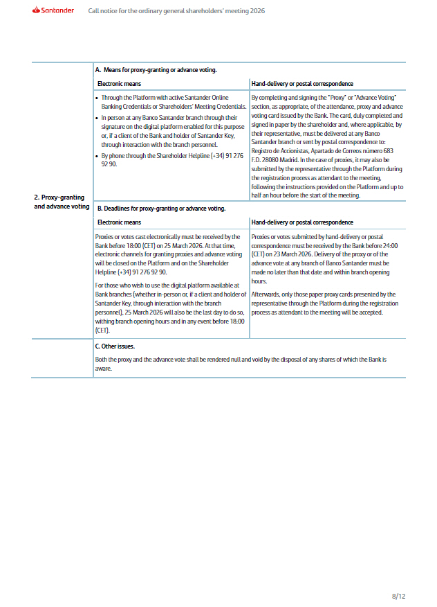 A. Means for proxy - granting or advance voting. 2. Proxy - granting and advance voting Hand - delivery or postal correspondence Electronic means By completing and signing the “Proxy” or “Advance Voting” section, as appropriate, of the attendance, proxy and advance voting card issued by the Bank. The card, duly completed and signed in paper by the shareholder and, where applicable, by their representative, must be delivered at any Banco Santander branch or sent by postal correspondence to: Registro de Accionistas, Apartado de Correos número 683 F.D. 28080 Madrid. In the case of proxies, it may also be submitted by the representative through the Platform during the registration process as attendant to the meeting, following the instructions provided on the Platform and up to half an hour before the start of the meeting. Through the Platform with active Santander Online Banking Credentials or Shareholders’ Meeting Credentials. In person at any Banco Santander branch through their signature on the digital platform enabled for this purpose or, if a client of the Bank and holder of Santander Key, through interaction with the branch personnel. By phone through the Shareholder Helpline (+34) 91 276 92 90. B. Deadlines for proxy - granting or advance voting. Hand - delivery or postal correspondence Electronic means Proxies or votes submitted by hand - delivery or postal correspondence must be received by the Bank before 24:00 (CET) on 23 March 2026. Delivery of the proxy or of the advance vote at any branch of Banco Santander must be made no later than that date and within branch opening hours. Afterwards, only those paper proxy cards presented by the representative through the Platform during the registration process as attendant to the meeting will be accepted. Proxies or votes cast electronically must be received by the Bank before 18:00 (CET) on 25 March 2026. At that time, electronic channels for granting proxies and advance voting will be closed on the Platform and on the Shareholder Helpline (+34) 91 276 92 90. For those who wish to use the digital platform available at Bank branches (whether in - person or, if a client and holder of Santander Key, through interaction with the branch personnel), 25 March 2026 will also be the last day to do so, withing branch opening hours and in any event before 18:00 (CET). C. Other issues. Both the proxy and the advance vote shall be rendered null and void by the disposal of any shares of which the Bank is aware. Call notice for the ordinary general shareholders’ meeting 2026 8/12
