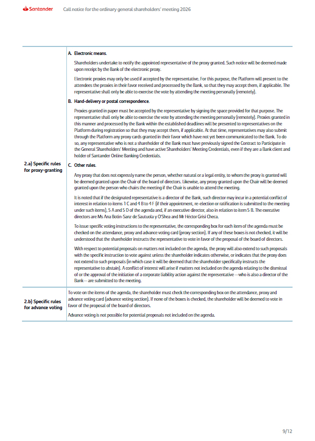 A. Electronic means . Shareholders undertake to notify the appointed representative of the proxy granted. Such notice will be deemed made upon receipt by the Bank of the electronic proxy. Electronic proxies may only be used if accepted by the representative. For this purpose, the Platform will present to the attendees the proxies in their favor received and processed by the Bank, so that they may accept them, if applicable. The representative shall only be able to exercise the vote by attending the meeting personally (remotely). B. Hand - delivery or postal correspondence . Proxies granted in paper must be accepted by the representative by signing the space provided for that purpose. The representative shall only be able to exercise the vote by attending the meeting personally (remotely). Proxies granted in this manner and processed by the Bank within the established deadlines will be presented to representatives on the Platform during registration so that they may accept them, if applicable. At that time, representatives may also submit through the Platform any proxy cards granted in their favor which have not yet been communicated to the Bank. To do so, any representative who is not a shareholder of the Bank must have previously signed the Contract to Participate in the General Shareholders’ Meeting and have active Shareholders’ Meeting Credentials, even if they are a Bank client and holder of Santander Online Banking Credentials. C. Other rules . Any proxy that does not expressly name the person, whether natural or a legal entity, to whom the proxy is granted will be deemed granted upon the Chair of the board of directors . Likewise, any proxy granted upon the Chair will be deemed granted upon the person who chairs the meeting if the Chair is unable to attend the meeting . It is noted that if the designated representative is a director of the Bank, such director may incur in a potential conflict of interest in relation to items 1 C and 4 B to 4 F (if their appointment, re - election or ratification is submitted to the meeting under such items), 5 A and 5 D of the agenda and, if an executive director, also in relation to item 5 B. The executive directors are Ms Ana Botín - Sanz de Sautuola y O’Shea and Mr Héctor Grisi Checa. To issue specific voting instructions to the representative, the corresponding box for each item of the agenda must be checked on the attendance, proxy and advance voting card (proxy section). If any of these boxes is not checked, it will be understood that the shareholder instructs the representative to vote in favor of the proposal of the board of directors. With respect to potential proposals on matters not included on the agenda, the proxy will also extend to such proposals with the specific instruction to vote against unless the shareholder indicates otherwise, or indicates that the proxy does not extend to such proposals (in which case it will be deemed that the shareholder specifically instructs the representative to abstain). A conflict of interest will arise if matters not included on the agenda relating to the dismissal of or the approval of the initiation of a corporate liability action against the representative — who is also a director of the Bank — are submitted to the meeting. 2.a) Specific rules for proxy - granting To vote on the items of the agenda, the shareholder must check the corresponding box on the attendance, proxy and advance voting card (advance voting section). If none of the boxes is checked, the shareholder will be deemed to vote in favor of the proposal of the board of directors. Advance voting is not possible for potential proposals not included on the agenda. 2.b) Specific rules for advance voting Call notice for the ordinary general shareholders’ meeting 2026 9/12