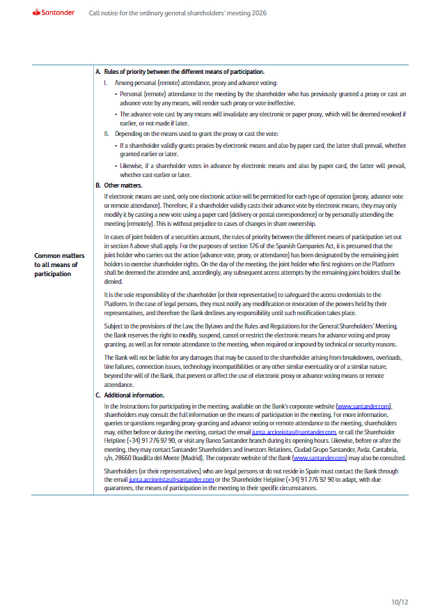 Call notice for the ordinary general shareholders’ meeting 2026 Common matters to all means of participation 10/12 A. Rules of priority between the different means of participation. I. Among personal (remote) attendance, proxy and advance voting: • Personal (remote) attendance to the meeting by the shareholder who has previously granted a proxy or cast an advance vote by any means, will render such proxy or vote ineffective. • The advance vote cast by any means will invalidate any electronic or paper proxy, which will be deemed revoked if earlier, or not made if later. II. Depending on the means used to grant the proxy or cast the vote: • If a shareholder validly grants proxies by electronic means and also by paper card, the latter shall prevail, whether granted earlier or later. • Likewise, if a shareholder votes in advance by electronic means and also by paper card, the latter will prevail, whether cast earlier or later. B. Other matters. If electronic means are used, only one electronic action will be permitted for each type of operation (proxy, advance vote or remote attendance). Therefore, if a shareholder validly casts their advance vote by electronic means, they may only modify it by casting a new vote using a paper card (delivery or postal correspondence) or by personally attending the meeting (remotely). This is without prejudice to cases of changes in share ownership. In cases of joint holders of a securities account, the rules of priority between the different means of participation set out in section A above shall apply. For the purposes of section 126 of the Spanish Companies Act, it is presumed that the joint holder who carries out the action (advance vote, proxy, or attendance) has been designated by the remaining joint holders to exercise shareholder rights. On the day of the meeting, the joint holder who first registers on the Platform shall be deemed the attendee and, accordingly, any subsequent access attempts by the remaining joint holders shall be denied. It is the sole responsibility of the shareholder (or their representative) to safeguard the access credentials to the Platform. In the case of legal persons, they must notify any modification or revocation of the powers held by their representatives, and therefore the Bank declines any responsibility until such notification takes place. Subject to the provisions of the Law, the Bylaws and the Rules and Regulations for the General Shareholders’ Meeting, the Bank reserves the right to modify, suspend, cancel or restrict the electronic means for advance voting and proxy granting, as well as for remote attendance to the meeting, when required or imposed by technical or security reasons. The Bank will not be liable for any damages that may be caused to the shareholder arising from breakdowns, overloads, line failures, connection issues, technology incompatibilities or any other similar eventuality or of a similar nature, beyond the will of the Bank, that prevent or affect the use of electronic proxy or advance voting means or remote attendance. C. Additional information. In the Instructions for participating in the meeting, available on the Bank’s corporate website ( www.santander.com ) , shareholders may consult the full information on the means of participation in the meeting. For more information, queries or questions regarding proxy - granting and advance voting or remote attendance to the meeting, shareholders may, either before or during the meeting, contact the email junta.accionistas@santander.com , or call the Shareholder Helpline (+34) 91 276 92 90, or visit any Banco Santander branch during its opening hours. Likewise, before or after the meeting, they may contact Santander Shareholders and Investors Relations, Ciudad Grupo Santander, Avda. Cantabria, s/n, 28660 Boadilla del Monte (Madrid). The corporate website of the Bank ( www.santander.com ) may also be consulted. Shareholders (or their representatives) who are legal persons or do not reside in Spain must contact the Bank through the email junta.accionistas@santander.com or the Shareholder Helpline (+34) 91 276 92 90 to adapt, with due guarantees, the means of participation in the meeting to their specific circumstances.
