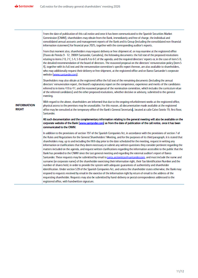 Call notice for the ordinary general shareholders’ meeting 2026 INFORMATION RIGHT 11/12 From the date of publication of this call notice and once it has been communicated to the Spanish Securities Market Commission (CNMV), shareholders may obtain from the Bank, immediately and free of charge, the individual and consolidated annual accounts and management reports of the Bank and its Group (including the consolidated non - financial information statement) for financial year 2025, together with the corresponding auditor’s reports. From that moment also, shareholders may request delivery or free shipment of, or may examine at the registered office (Paseo de Pereda 9 - 12, 39004 Santander, Cantabria), the following documents: the full text of the proposed resolutions relating to items 2 B, 2 C, 5 A, 5 B and 6 A to 6 C of the agenda; and the required directors’ reports or, in the case of item 5 B, the detailed recommendation of the board of directors. The reasoned proposal on the directors’ remuneration policy (item 5 A), together with its full text and the remuneration committee's specific report thereon, are also available to shareholders, who may additionally request their delivery or free shipment, at the registered office and on Banco Santander's corporate website ( www.santander.com ) . Shareholders may also obtain at the registered office the full text of the remaining documents (including the annual directors’ remuneration report, the board’s explanatory report on the competence, experience and merits of the candidates referred to in items 4 B to 4 F, and the reasoned proposal of the nomination committee, which includes the curriculum vitae of the referred candidates) and the other proposed resolutions, whether decisive or advisory, submitted to the general meeting. With regard to the above, shareholders are informed that due to the ongoing refurbishment works at the registered office, physical access to the premises may be unavailable. For this reason, all documentation made available at the registered office may be consulted at the temporary office of the Bank’s General Secretariat, located at calle Calvo Sotelo 19, first floor, Santander. All such documentation and the complementary information relating to the general meeting will also be available on the corporate website of the Bank ( www.santander.com ) as from the date of publication of the call notice, once it has been communicated to the CNMV. In addition to the provisions of section 197 of the Spanish Companies Act, in accordance with the provisions of section 7 of the Rules and Regulations for the General Shareholders’ Meeting, and for the purposes of its third paragraph, it is stated that shareholders may, up to and including the fifth day prior to the date scheduled for the meeting, request in writing any information or clarifications that they deem necessary or submit any written questions they consider pertinent regarding the matters included on the agenda, and request written clarifications regarding the information accessible to the public that the Bank has provided to the CNMV since the last general meeting and regarding the external auditor’s report of Banco Santander. These requests may be submitted by email to junta.accionistas@santander.com , and must include the name and surname (or corporate name) of the shareholder exercising their information right, their Tax Identification Number and the number of shares held, in order to provide the system with adequate guarantees of authenticity and shareholder identification. Under section 539 of the Spanish Companies Act, and unless the shareholder states otherwise, the Bank may respond to requests received by email in the exercise of the information right by return of email to the address of the requesting shareholder. Requests may also be submitted by hand - delivery or postal correspondence addressed to the registered office, with handwritten signature.