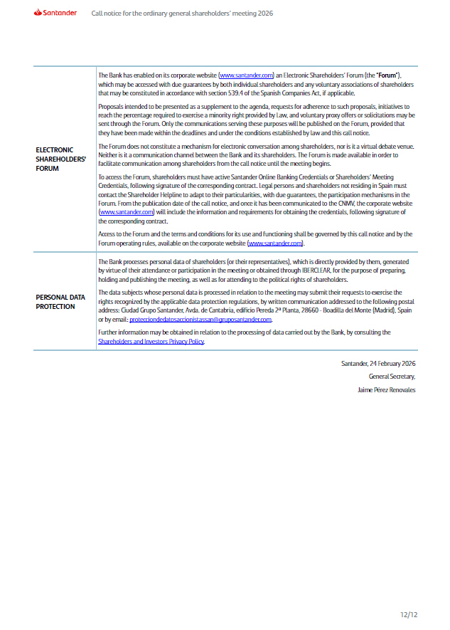 The Bank has enabled on its corporate website ( www.santander.com ) an Electronic Shareholders’ Forum (the “ Forum ”), which may be accessed with due guarantees by both individual shareholders and any voluntary associations of shareholders that may be constituted in accordance with section 539.4 of the Spanish Companies Act, if applicable. Proposals intended to be presented as a supplement to the agenda, requests for adherence to such proposals, initiatives to reach the percentage required to exercise a minority right provided by Law, and voluntary proxy offers or solicitations may be sent through the Forum. Only the communications serving these purposes will be published on the Forum, provided that they have been made within the deadlines and under the conditions established by law and this call notice. The Forum does not constitute a mechanism for electronic conversation among shareholders, nor is it a virtual debate venue. Neither is it a communication channel between the Bank and its shareholders. The Forum is made available in order to facilitate communication among shareholders from the call notice until the meeting begins. To access the Forum, shareholders must have active Santander Online Banking Credentials or Shareholders’ Meeting Credentials, following signature of the corresponding contract. Legal persons and shareholders not residing in Spain must contact the Shareholder Helpline to adapt to their particularities, with due guarantees, the participation mechanisms in the Forum. From the publication date of the call notice, and once it has been communicated to the CNMV, the corporate website ( www.santander.com ) will include the information and requirements for obtaining the credentials, following signature of the corresponding contract. Access to the Forum and the terms and conditions for its use and functioning shall be governed by this call notice and by the Forum operating rules, available on the corporate website ( www.santander.com ) . ELECTRONIC SHAREHOLDERS’ FORUM The Bank processes personal data of shareholders (or their representatives), which is directly provided by them, generated by virtue of their attendance or participation in the meeting or obtained through IBERCLEAR, for the purpose of preparing, holding and publishing the meeting, as well as for attending to the political rights of shareholders. The data subjects whose personal data is processed in relation to the meeting may submit their requests to exercise the rights recognized by the applicable data protection regulations, by written communication addressed to the following postal address: Ciudad Grupo Santander, Avda. de Cantabria, edificio Pereda 2ª Planta, 28660 - Boadilla del Monte (Madrid), Spain or by email: protecciondedatosaccionistassan@gruposantander.com . Further information may be obtained in relation to the processing of data carried out by the Bank, by consulting the Shareholders and Investors Privacy Policy . PERSONAL DATA PROTECTION Call notice for the ordinary general shareholders’ meeting 2026 Santander, 24 February 2026 General Secretary, Jaime Pérez Renovales 12/12