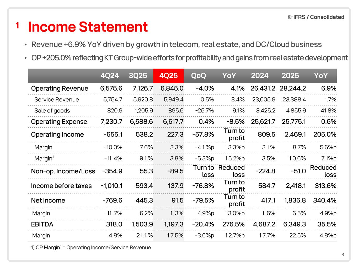 19 K-IFRS Balance Sheet2 Consolidated 4Q24 1Q25 2Q25 3Q25 4Q25 KT Separate 4Q24 1Q25 2Q25 3Q25 4Q25 Assets 41,880.0 42,185.6 42,193.3 43,012.8 42,948.6 Assets 29,528.9 29,041.0 29,008.7 29,049.2 29,677.6 Current assets 14,251.9 14,458.5 14,385.4 15,123.6 13,977.5 Current assets 6,892.6 7,016.3 7,022.2 7,127.8 7,212.5 Cash & cash equivalents 3,716.7 3,133.0 3,794.4 3,890.3 3,507.0 Cash & cash equi. 1,540.6 1,150.6 1,419.9 1,095.5 1,585.9 Trade & other receivables 3,987.3 4,217.8 3,955.6 4,215.7 3,963.7 Trade & other rec. 2,904.8 3,209.5 2,958.1 3,186.5 2,915.7 Inventories 940.2 853.9 443.9 443.8 416.1 Inventories 224.7 190.2 166.7 155.2 94.3 Other current asset 5,607.8 6,253.8 6,191.5 6,573.7 6,090.7 Other current asset 2,222.5 2,465.9 2,477.5 2,690.7 2,616.6 - Prepaid_Contract cost 1,233.6 1,325.3 1,304.0 1,450.7 1,484.6 - Prepaid_Contract cost 1,308.8 1,405.7 1,389.3 1,549.9 1,583.8 - Contract assets 577.4 597.9 744.2 805.2 764.9 - Contract assets 521.1 521.4 667.8 707.8 630.0 Non-current assets 27,628.0 27,727.1 27,808.0 27,889.2 28,971.0 Non-current assets 22,636.3 22,024.7 21,986.5 21,921.4 22,465.1 Trade & other rec 381.8 336.3 378.3 422.1 463.1 Trade & other rec 309.1 241.1 278.9 319.9 362.9 Tangible assets 14,825.8 14,398.1 14,226.4 14,121.1 14,258.5 Tangible assets 11,477.7 11,068.3 10,913.7 10,748.7 10,932.3 Other current assets 12,420.4 12,992.7 13,203.3 13,346.0 14,249.5 Other current assets 9,953.2 9,856.6 9,941.2 10,028.4 10,357.6 - Prepaid_Contract cost 504.6 462.3 631.5 629.2 614.5 - Prepaid_Contract cost 493.4 454.8 625.6 624.1 595.2 - Contract assets 223.4 208.3 146.1 173.2 261.4 - Contract assets 198.2 182.3 116.1 140.1 226.8 Liabilities 23,883.4 23,847.3 23,316.2 23,752.8 23,490.6 Liabilities 15,108.7 14,409.3 14,165.6 13,986.4 14,451.0 Current liabilities 13,874.7 13,134.6 12,123.5 12,223.6 11,692.8 Current liabilities 7,633.2 7,265.4 7,074.7 6,539.8 6,862.3 Trade & other payables 7,394.8 6,952.5 7,077.7 7,770.5 6,868.7 Trade & other payables 4,585.8 4,258.8 4,459.9 4,545.4 4,592.5 Short-term borrowings 3,904.8 3,649.1 2,934.3 2,454.1 2,499.5 Short-term borrowings 2,434.2 2,263.0 1,895.4 1,310.4 1,323.8 Others 2,575.2 2,533.0 2,111.4 1,999.0 2,324.5 Others 613.2 743.6 719.5 684.1 946.0 - Contract liabilities 226.4 244.1 330.3 228.1 207.8 - Contract liabilities 208.4 217.8 204.8 198.3 185.7 Non-current liabilities 10,008.7 10,712.7 11,192.7 11,529.2 11,797.8 Non-current liabilities 7,475.5 7,144.0 7,090.9 7,446.6 7,588.7 Trade & other payables 578.4 372.4 383.7 386.6 328.3 Trade & other payables 979.4 672.0 666.8 649.8 622.1 Long-term borrowings 6,615.9 7,520.5 7,815.9 8,078.2 8,286.0 Long-term borrowings 5,437.7 5,417.6 5,184.4 5,499.5 5,744.9 Others 2,814.3 2,819.9 2,993.2 3,064.4 3,183.5 Others 1,058.4 1,054.4 1,239.7 1,297.2 1,221.7 - Contract liabilities 46.9 48.4 36.6 33.4 31.9 - Contract liabilities 34.5 37.5 28.0 27.3 24.8 Equity 17,996.5 18,338.3 18,877.1 19,259.9 19,458.0 Equity 14,420.2 14,631.7 14,843.1 15,062.8 15,226.6 Retained earnings 13,779.8 14,197.4 14,739.9 14,986.2 14,964.3 Retained earnings 11,717.9 11,965.0 12,156.4 12,301.6 12,219.9 (Unit: KRW bn)