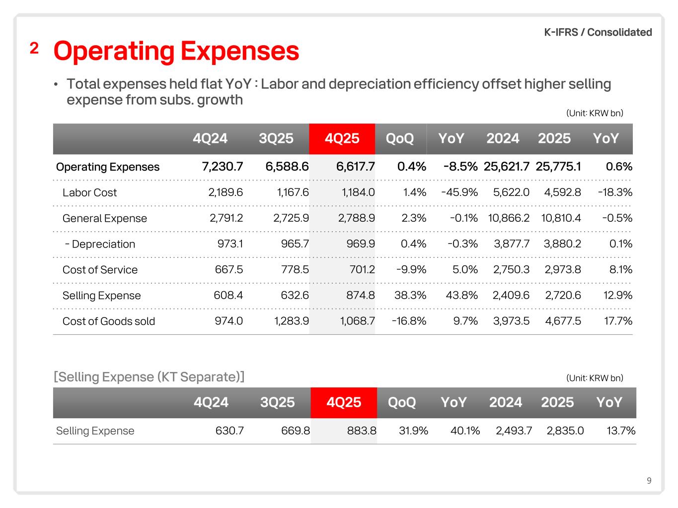 8 Income Statement1 (Unit: KRW bn) 1) OP Margin1 = Operating Income/Service Revenue 4Q24 3Q25 4Q25 QoQ YoY 2024 2025 YoY Operating Revenue 6,575.6 7,126.7 6,845.0 -4.0% 4.1% 26,431.2 28,244.2 6.9% Service Revenue 5,754.7 5,920.8 5,949.4 0.5% 3.4% 23,005.9 23,388.4 1.7% Sale of goods 820.9 1,205.9 895.6 -25.7% 9.1% 3,425.2 4,855.9 41.8% Operating Expense 7,230.7 6,588.6 6,617.7 0.4% -8.5% 25,621.7 25,775.1 0.6% Operating Income -655.1 538.2 227.3 -57.8% Turn to profit 809.5 2,469.1 205.0% Margin -10.0% 7.6% 3.3% -4.1 %p 1 3.3%p 3.1 % 8.7% 5.6%p Margin1 -11 .4% 9.1 % 3.8% -5.3%p 1 5.2%p 3.5% 1 0.6% 7.1%p Non-op. Income/Loss -354.9 55.3 -89.5 Turn to loss Reduced loss -224.8 -51.0 Reduced loss Income before taxes -1,010.1 593.4 137.9 -76.8% Turn to profit 584.7 2,418.1 313.6% Net Income -769.6 445.3 91.5 -79.5% Turn to profit 417.1 1,836.8 340.4% Margin -11 .7% 6.2% 1 .3% -4.9%p 13.0%p 1 .6% 6.5% 4.9%p EBITDA 318.0 1,503.9 1,197.3 -20.4% 276.5% 4,687.2 6,349.3 35.5% Margin 4.8% 21 .1 % 1 7.5% -3.6%p 1 2.7%p 1 7.7% 22.5% 4.8%p • Revenue +6.9% YoY driven by growth in telecom, real estate, and DC/Cloud business • OP +205.0% reflecting KT Group-wide efforts for profitability and gains from real estate development K-IFRS / Consolidated