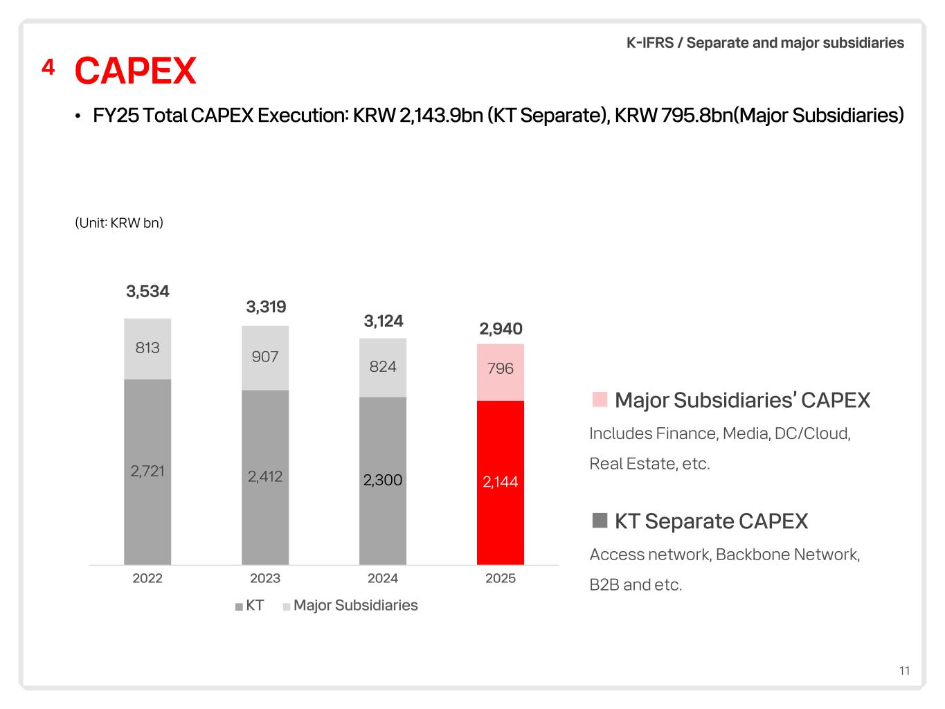 10 Balance Sheet3 • Net debt ratio maintained at prior-year levels, due to capital growth from higher net income (Unit: KRW bn) K-IFRS / Consolidated 121.5% 115.4% 134.9% 130.1% 129.8% 127.3% 122.8% 132.7% 130.0% 123.5% 123.3% 120.7% 46.6% 44.6% 38.5% 39.5% 38.5% 33.5% 30.3% 37.8% 43.8% 36.8% 34.5% 37.4% 1Q23 2Q23 3Q23 4Q23 1Q24 2Q24 3Q24 4Q24 1Q25 2Q25 3Q25 4Q25 Debt/Equity Net Debt/Equity Dec. 31, 2024 Sep. 30, 2025 Dec. 31, 2025 QoQ YoY Assets 41,880.0 43,012.8 42,948.6 -0.1% 2.6% Cash & Cash equivalents 3,729.5 3,890.3 3,507.0 -9.9% -5.6% Liabilities 23,850.4 23,752.8 23,490.6 -1.1% -1.6% Borrowings 10,520.7 10,532.3 10,785.6 2.4% 2.5% Equity 18,029.5 19,259.9 19,458.0 1.0% 8.1% Capital Stock 1,564.5 1,564.5 1,564.5 - - Net Debt 6,804.0 6,642.0 7,278.6 9.6% 7.0% Debt / Equity 132.7% 123.3% 120.7% -2.6%p -12.0%p Net Debt / Equity 37.8% 34.5% 37.4% 2.9%p -0.4%p