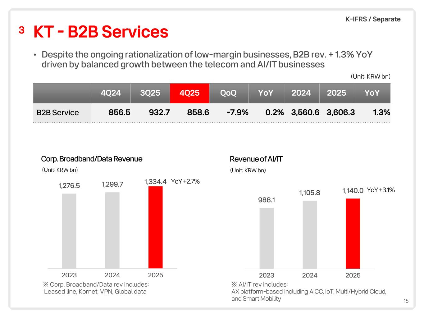 14 KT - Fixed Line • Broadband rev up +1.9% YoY, due to increase in GiGA subscribers and value-added services • Media rev. up +1.7% YoY, backed by IPTV net adds and growth in outdoor advertising biz. 2 (Unit: Thousands) Broadband Subscribers (Unit: Thousands) IPTV Subscribers 4Q24 3Q25 4Q25 QoQ YoY 2024 2025 YoY Fixed Line 1,317.1 1,331.9 1,333.0 -0.1% 1.2% 5,268.8 5,311.3 0.8% Broadband 625.4 636.7 636.8 0.0% 1.8% 2,486.9 2,533.5 1.9% Media 523.2 534.4 538.3 0.7% 2.9% 2,082.6 2,118.9 1.7% Home Telephony 168.6 160.9 157.9 -1.8% -6.3% 699.4 658.9 -5.8% Subscribers GiGA (%) (Unit: KRW bn) K-IFRS / Separate 9,956 9,984 10,073 10,135 10,170 4Q24 1Q25 2Q25 3Q25 4Q25 69.2% 69.4% 69.7% 70.0% 70.1% 9,449 9,438 9,490 9,520 9,533 4Q24 1Q25 2Q25 3Q25 4Q25