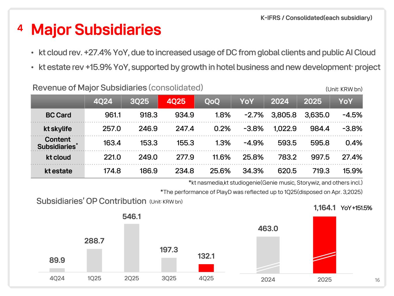 15 KT - B2B Services3 (Unit: KRW bn) Corp.Broadband/Data Revenue Revenue of AI/IT ※ AI/IT rev includes: AX platform-based including AICC, IoT, Multi/Hybrid Cloud, and Smart Mobility 4Q24 3Q25 4Q25 QoQ YoY 2024 2025 YoY B2B Service 856.5 932.7 858.6 -7.9% 0.2% 3,560.6 3,606.3 1.3% (Unit: KRW bn) (Unit: KRW bn) ※ Corp. Broadband/Data rev includes: Leased line, Kornet, VPN, Global data K-IFRS / Separate • Despite the ongoing rationalization of low-margin businesses, B2B rev. + 1.3% YoY driven by balanced growth between the telecom and AI/IT businesses YoY +3.1% YoY +2.7% 1,276.5 1,299.7 1,334.4 2023 2024 2025 988.1 1,105.8 1,140.0 2023 2024 2025