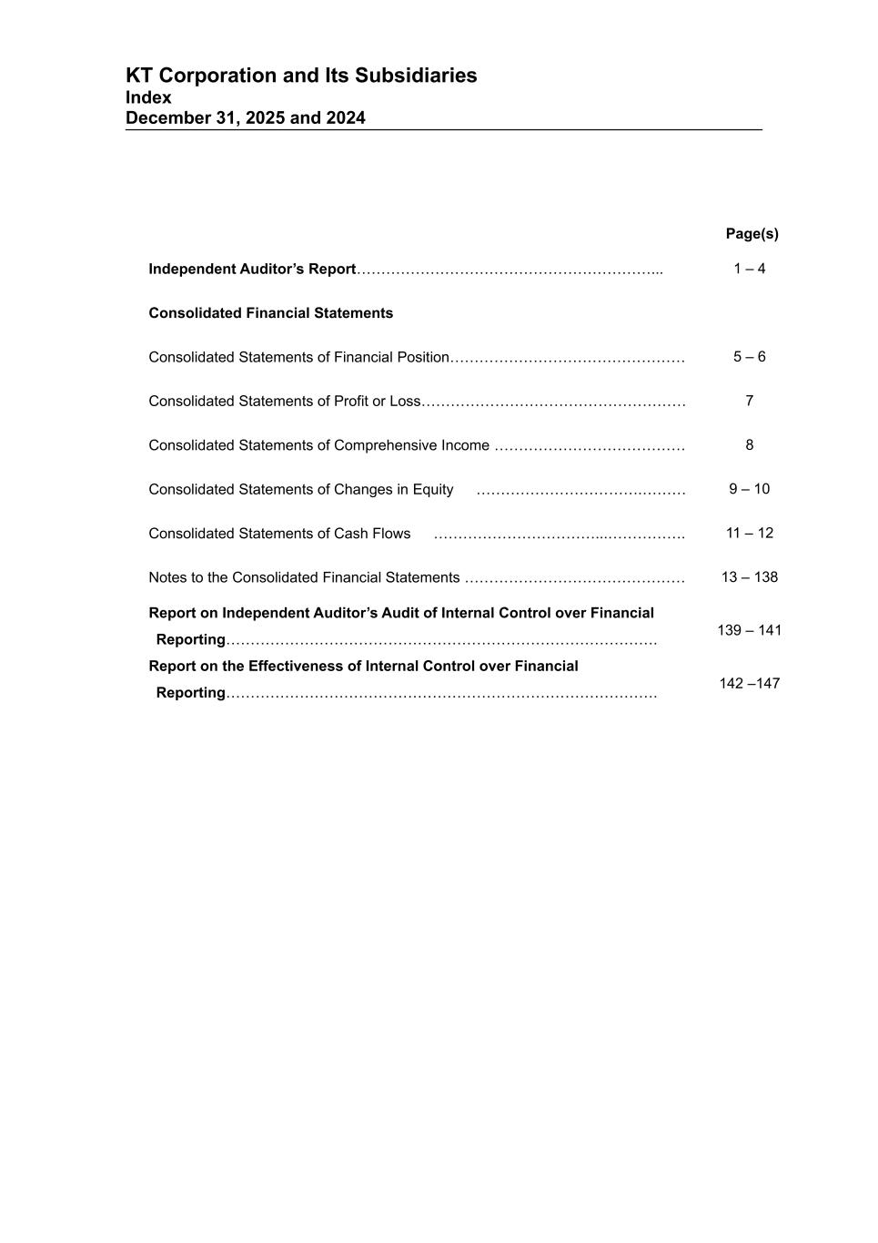 KT Corporation and Its Subsidiaries Index December 31, 2025 and 2024 Page(s) Independent Auditor’s Report……………………………………………………... 1 – 4 Consolidated Financial Statements Consolidated Statements of Financial Position………………………………………… 5 – 6 Consolidated Statements of Profit or Loss……………………………………………… 7 Consolidated Statements of Comprehensive Income ………………………………… 8 Consolidated Statements of Changes in Equity …………………………….……… 9 – 10 Consolidated Statements of Cash Flows ……………………………...……………. 11 – 12 Notes to the Consolidated Financial Statements ……………………………………… 13 – 138 Report on Independent Auditor’s Audit of Internal Control over Financial Reporting……………………………………………………………………………. 139 – 141 Report on the Effectiveness of Internal Control over Financial Reporting……………………………………………………………………………. 142 –147