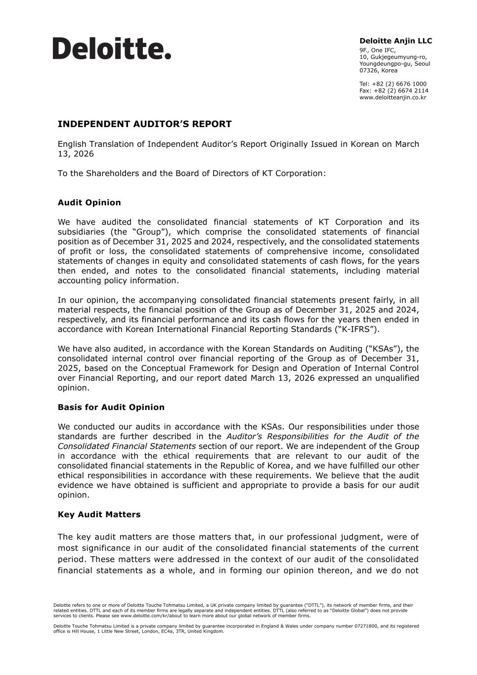 INDEPENDENT AUDITOR’S REPORT English Translation of Independent Auditor’s Report Originally Issued in Korean on March 13, 2026 To the Shareholders and the Board of Directors of KT Corporation: Audit Opinion We have audited the consolidated financial statements of KT Corporation and its subsidiaries (the “Group”), which comprise the consolidated statements of financial position as of December 31, 2025 and 2024, respectively, and the consolidated statements of profit or loss, the consolidated statements of comprehensive income, consolidated statements of changes in equity and consolidated statements of cash flows, for the years then ended, and notes to the consolidated financial statements, including material accounting policy information. In our opinion, the accompanying consolidated financial statements present fairly, in all material respects, the financial position of the Group as of December 31, 2025 and 2024, respectively, and its financial performance and its cash flows for the years then ended in accordance with Korean International Financial Reporting Standards (“K-IFRS”). We have also audited, in accordance with the Korean Standards on Auditing (“KSAs”), the consolidated internal control over financial reporting of the Group as of December 31, 2025, based on the Conceptual Framework for Design and Operation of Internal Control over Financial Reporting, and our report dated March 13, 2026 expressed an unqualified opinion. Basis for Audit Opinion We conducted our audits in accordance with the KSAs. Our responsibilities under those standards are further described in the Auditor’s Responsibilities for the Audit of the Consolidated Financial Statements section of our report. We are independent of the Group in accordance with the ethical requirements that are relevant to our audit of the consolidated financial statements in the Republic of Korea, and we have fulfilled our other ethical responsibilities in accordance with these requirements. We believe that the audit evidence we have obtained is sufficient and appropriate to provide a basis for our audit opinion. Key Audit Matters The key audit matters are those matters that, in our professional judgment, were of most significance in our audit of the consolidated financial statements of the current period. These matters were addressed in the context of our audit of the consolidated financial statements as a whole, and in forming our opinion thereon, and we do not Deloitte Anjin LLC 9F., One IFC, 10, Gukjegeumyung-ro, Youngdeungpo-gu, Seoul 07326, Korea Tel: +82 (2) 6676 1000 Fax: +82 (2) 6674 2114 www.deloitteanjin.co.kr