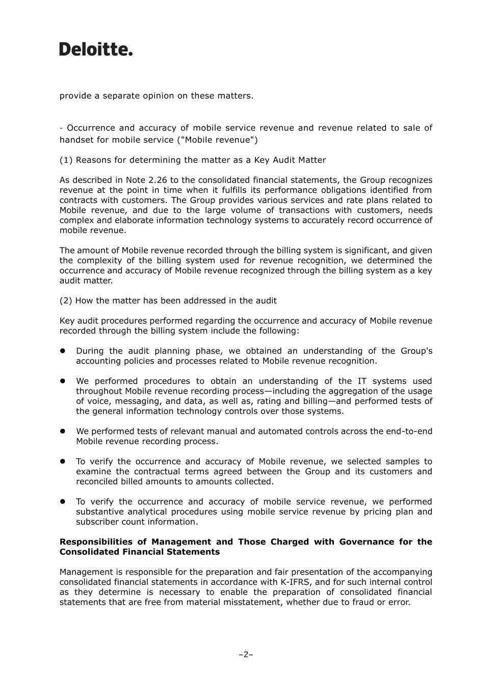provide a separate opinion on these matters. - Occurrence and accuracy of mobile service revenue and revenue related to sale of handset for mobile service ("Mobile revenue") (1) Reasons for determining the matter as a Key Audit Matter As described in Note 2.26 to the consolidated financial statements, the Group recognizes revenue at the point in time when it fulfills its performance obligations identified from contracts with customers. The Group provides various services and rate plans related to Mobile revenue, and due to the large volume of transactions with customers, needs complex and elaborate information technology systems to accurately record occurrence of mobile revenue. The amount of Mobile revenue recorded through the billing system is significant, and given the complexity of the billing system used for revenue recognition, we determined the occurrence and accuracy of Mobile revenue recognized through the billing system as a key audit matter. (2) How the matter has been addressed in the audit Key audit procedures performed regarding the occurrence and accuracy of Mobile revenue recorded through the billing system include the following: ⚫ During the audit planning phase, we obtained an understanding of the Group's accounting policies and processes related to Mobile revenue recognition. ⚫ We performed procedures to obtain an understanding of the IT systems used throughout Mobile revenue recording process—including the aggregation of the usage of voice, messaging, and data, as well as, rating and billing—and performed tests of the general information technology controls over those systems. ⚫ We performed tests of relevant manual and automated controls across the end-to-end Mobile revenue recording process. ⚫ To verify the occurrence and accuracy of Mobile revenue, we selected samples to examine the contractual terms agreed between the Group and its customers and reconciled billed amounts to amounts collected. ⚫ To verify the occurrence and accuracy of mobile service revenue, we performed substantive analytical procedures using mobile service revenue by pricing plan and subscriber count information. Responsibilities of Management and Those Charged with Governance for the Consolidated Financial Statements Management is responsible for the preparation and fair presentation of the accompanying consolidated financial statements in accordance with K-IFRS, and for such internal control as they determine is necessary to enable the preparation of consolidated financial statements that are free from material misstatement, whether due to fraud or error. -2-