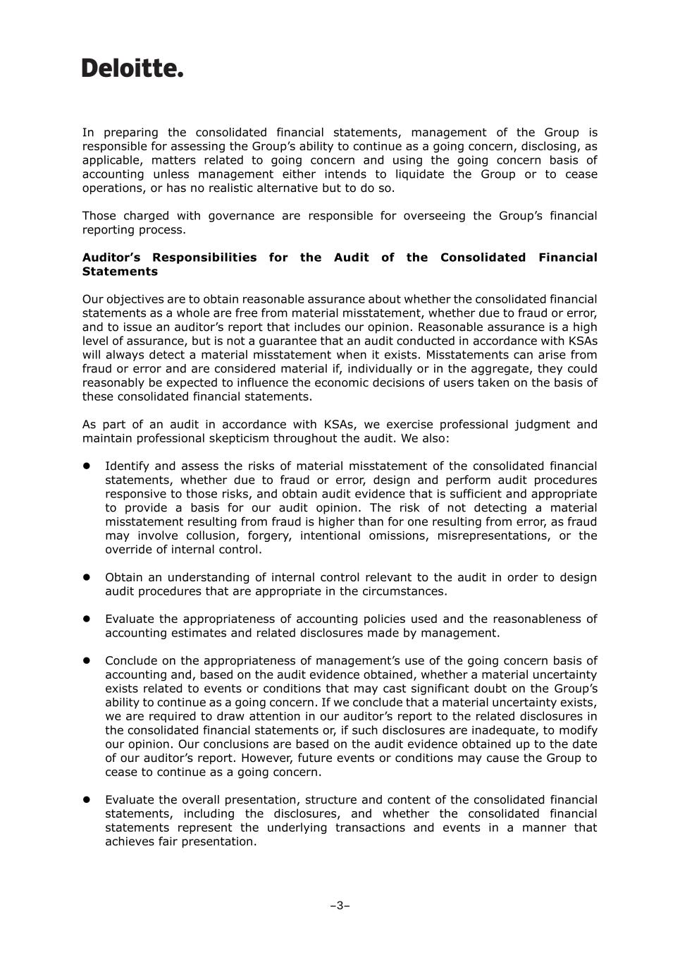 In preparing the consolidated financial statements, management of the Group is responsible for assessing the Group’s ability to continue as a going concern, disclosing, as applicable, matters related to going concern and using the going concern basis of accounting unless management either intends to liquidate the Group or to cease operations, or has no realistic alternative but to do so. Those charged with governance are responsible for overseeing the Group’s financial reporting process. Auditor’s Responsibilities for the Audit of the Consolidated Financial Statements Our objectives are to obtain reasonable assurance about whether the consolidated financial statements as a whole are free from material misstatement, whether due to fraud or error, and to issue an auditor’s report that includes our opinion. Reasonable assurance is a high level of assurance, but is not a guarantee that an audit conducted in accordance with KSAs will always detect a material misstatement when it exists. Misstatements can arise from fraud or error and are considered material if, individually or in the aggregate, they could reasonably be expected to influence the economic decisions of users taken on the basis of these consolidated financial statements. As part of an audit in accordance with KSAs, we exercise professional judgment and maintain professional skepticism throughout the audit. We also: ⚫ Identify and assess the risks of material misstatement of the consolidated financial statements, whether due to fraud or error, design and perform audit procedures responsive to those risks, and obtain audit evidence that is sufficient and appropriate to provide a basis for our audit opinion. The risk of not detecting a material misstatement resulting from fraud is higher than for one resulting from error, as fraud may involve collusion, forgery, intentional omissions, misrepresentations, or the override of internal control. ⚫ Obtain an understanding of internal control relevant to the audit in order to design audit procedures that are appropriate in the circumstances. ⚫ Evaluate the appropriateness of accounting policies used and the reasonableness of accounting estimates and related disclosures made by management. ⚫ Conclude on the appropriateness of management’s use of the going concern basis of accounting and, based on the audit evidence obtained, whether a material uncertainty exists related to events or conditions that may cast significant doubt on the Group’s ability to continue as a going concern. If we conclude that a material uncertainty exists, we are required to draw attention in our auditor’s report to the related disclosures in the consolidated financial statements or, if such disclosures are inadequate, to modify our opinion. Our conclusions are based on the audit evidence obtained up to the date of our auditor’s report. However, future events or conditions may cause the Group to cease to continue as a going concern. ⚫ Evaluate the overall presentation, structure and content of the consolidated financial statements, including the disclosures, and whether the consolidated financial statements represent the underlying transactions and events in a manner that achieves fair presentation. -3-
