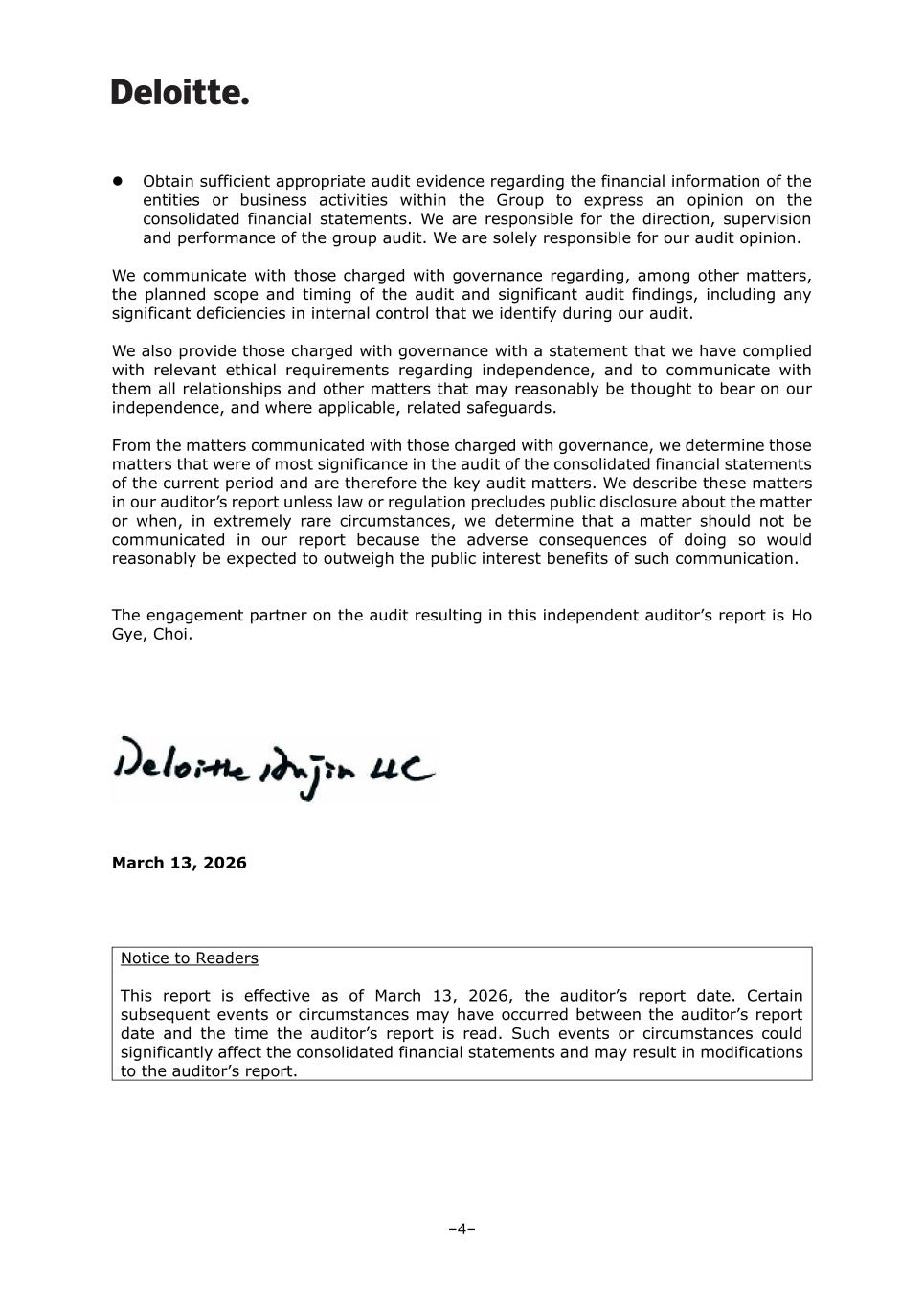 ⚫ Obtain sufficient appropriate audit evidence regarding the financial information of the entities or business activities within the Group to express an opinion on the consolidated financial statements. We are responsible for the direction, supervision and performance of the group audit. We are solely responsible for our audit opinion. We communicate with those charged with governance regarding, among other matters, the planned scope and timing of the audit and significant audit findings, including any significant deficiencies in internal control that we identify during our audit. We also provide those charged with governance with a statement that we have complied with relevant ethical requirements regarding independence, and to communicate with them all relationships and other matters that may reasonably be thought to bear on our independence, and where applicable, related safeguards. From the matters communicated with those charged with governance, we determine those matters that were of most significance in the audit of the consolidated financial statements of the current period and are therefore the key audit matters. We describe these matters in our auditor’s report unless law or regulation precludes public disclosure about the matter or when, in extremely rare circumstances, we determine that a matter should not be communicated in our report because the adverse consequences of doing so would reasonably be expected to outweigh the public interest benefits of such communication. The engagement partner on the audit resulting in this independent auditor’s report is Ho Gye, Choi. March 13, 2026 Notice to Readers This report is effective as of March 13, 2026, the auditor’s report date. Certain subsequent events or circumstances may have occurred between the auditor’s report date and the time the auditor’s report is read. Such events or circumstances could significantly affect the consolidated financial statements and may result in modifications to the auditor’s report. -4-