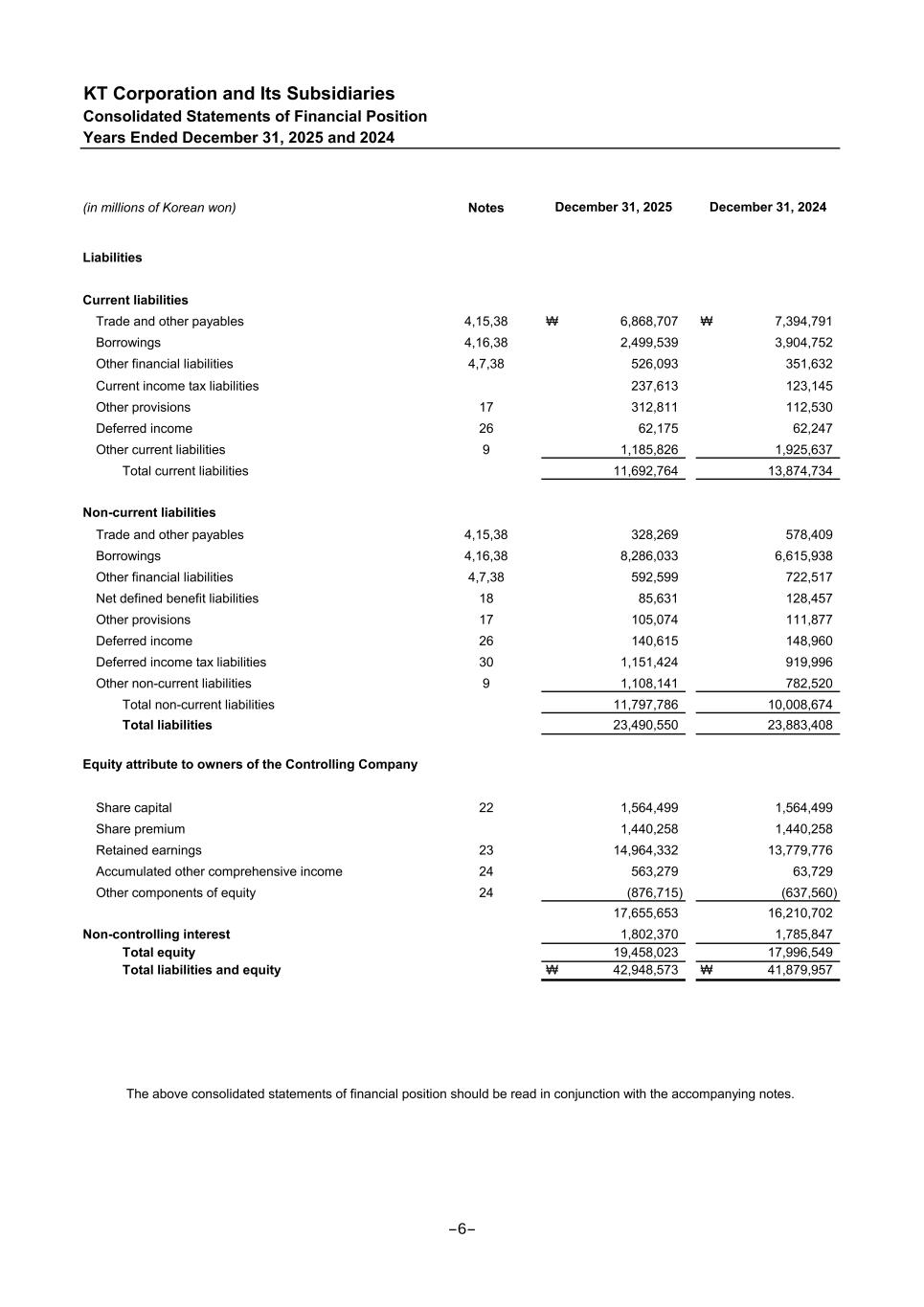 KT Corporation and Its Subsidiaries Consolidated Statements of Financial Position Years Ended December 31, 2025 and 2024 (in millions of Korean won) Notes Liabilities Current liabilities Trade and other payables 4,15,38 ₩ 6,868,707 ₩ 7,394,791 Borrowings 4,16,38 2,499,539 3,904,752 Other financial liabilities 4,7,38 526,093 351,632 Current income tax liabilities 237,613 123,145 Other provisions 17 312,811 112,530 Deferred income 26 62,175 62,247 Other current liabilities 9 1,185,826 1,925,637 Total current liabilities 11,692,764 13,874,734 Non-current liabilities Trade and other payables 4,15,38 328,269 578,409 Borrowings 4,16,38 8,286,033 6,615,938 Other financial liabilities 4,7,38 592,599 722,517 Net defined benefit liabilities 18 85,631 128,457 Other provisions 17 105,074 111,877 Deferred income 26 140,615 148,960 Deferred income tax liabilities 30 1,151,424 919,996 Other non-current liabilities 9 1,108,141 782,520 Total non-current liabilities 11,797,786 10,008,674 Total liabilities 23,490,550 23,883,408 Equity attribute to owners of the Controlling Company Share capital 22 1,564,499 1,564,499 Share premium 1,440,258 1,440,258 Retained earnings 23 14,964,332 13,779,776 Accumulated other comprehensive income 24 563,279 63,729 Other components of equity 24 (876,715) (637,560) 17,655,653 16,210,702 Non-controlling interest 1,802,370 1,785,847 Total equity 19,458,023 17,996,549 Total liabilities and equity ₩ 42,948,573 ₩ 41,879,957 December 31, 2025 December 31, 2024 The above consolidated statements of financial position should be read in conjunction with the accompanying notes. -6-