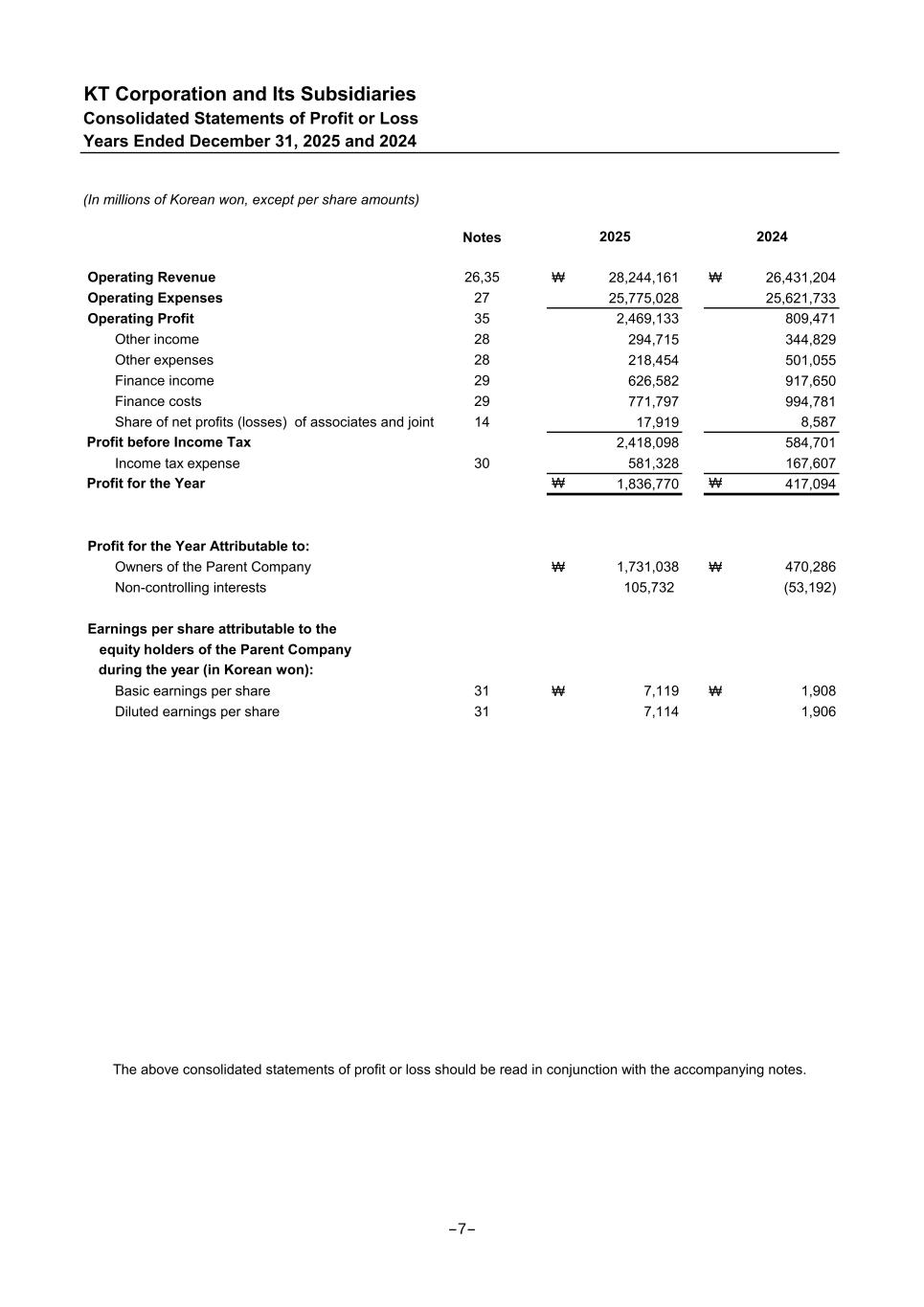 (In millions of Korean won, except per share amounts) Notes Operating Revenue 26,35 ₩ 28,244,161 ₩ 26,431,204 Operating Expenses 27 25,775,028 25,621,733 Operating Profit 35 2,469,133 809,471 Other income 28 294,715 344,829 Other expenses 28 218,454 501,055 Finance income 29 626,582 917,650 Finance costs 29 771,797 994,781 Share of net profits (losses) of associates and joint ventures14 17,919 8,587 2,418,098 584,701 Income tax expense 30 581,328 167,607 ₩ 1,836,770 ₩ 417,094 Profit for the Year Attributable to: Owners of the Parent Company ₩ 1,731,038 ₩ 470,286 Non-controlling interests 105,732 (53,192) Earnings per share attributable to the equity holders of the Parent Company Basic earnings per share 31 ₩ 7,119 ₩ 1,908 Diluted earnings per share 31 7,114 1,906 Profit for the Year during the year (in Korean won): KT Corporation and Its Subsidiaries Consolidated Statements of Profit or Loss Years Ended December 31, 2025 and 2024 2025 2024 Profit before Income Tax The above consolidated statements of profit or loss should be read in conjunction with the accompanying notes. -7-