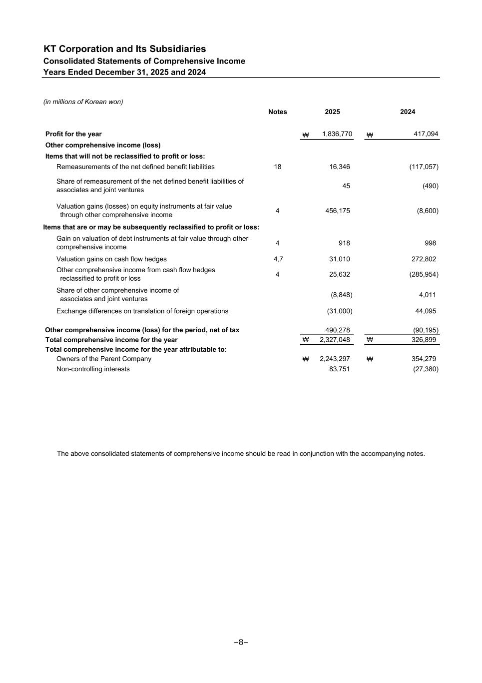 KT Corporation and Its Subsidiaries Consolidated Statements of Comprehensive Income Years Ended December 31, 2025 and 2024 (in millions of Korean won) Notes 2025 2024 Profit for the year ₩ 1,836,770 ₩ 417,094 Other comprehensive income (loss) Items that will not be reclassified to profit or loss: Remeasurements of the net defined benefit liabilities 18 16,346 (117,057) 45 (490) 4 456,175 (8,600) Items that are or may be subsequently reclassified to profit or loss: 4 918 998 Valuation gains on cash flow hedges 4,7 31,010 272,802 4 25,632 (285,954) (8,848) 4,011 Exchange differences on translation of foreign operations (31,000) 44,095 490,278 (90,195) Total comprehensive income for the year ₩ 2,327,048 ₩ 326,899 Total comprehensive income for the year attributable to: Owners of the Parent Company ₩ 2,243,297 ₩ 354,279 Non-controlling interests 83,751 (27,380) The above consolidated statements of comprehensive income should be read in conjunction with the accompanying notes. Share of remeasurement of the net defined benefit liabilities of associates and joint ventures Other comprehensive income from cash flow hedges reclassified to profit or loss Share of other comprehensive income of associates and joint ventures Other comprehensive income (loss) for the period, net of tax Valuation gains (losses) on equity instruments at fair value through other comprehensive income Gain on valuation of debt instruments at fair value through other comprehensive income -8-