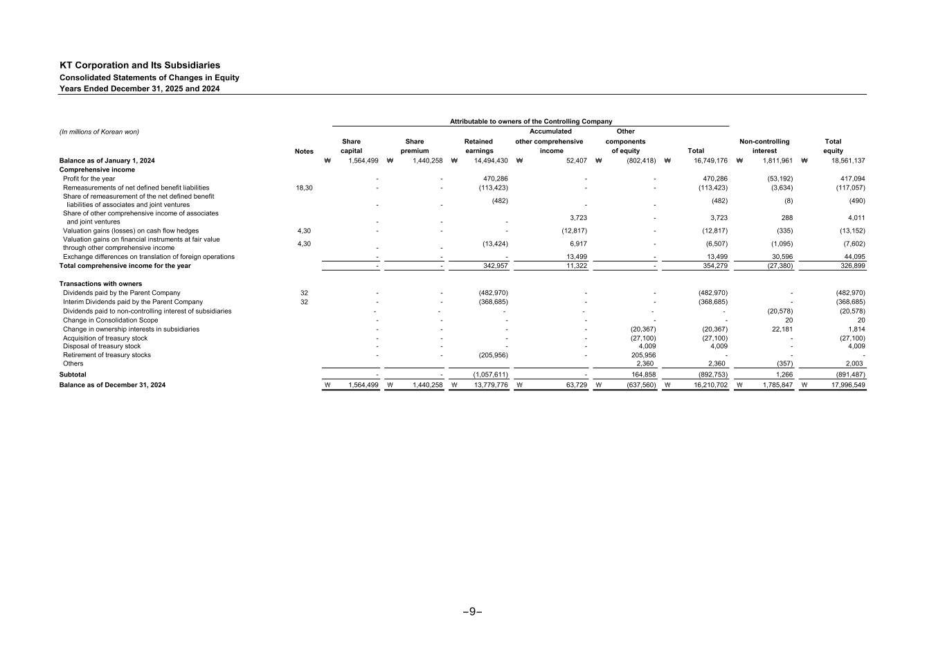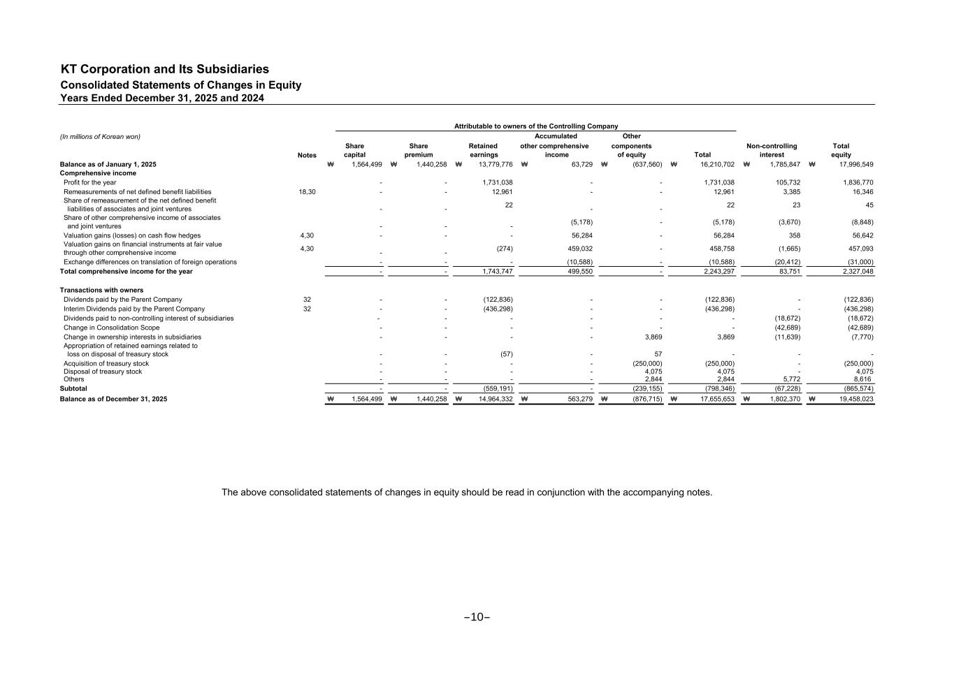 KT Corporation and Its Subsidiaries Consolidated Statements of Changes in Equity Years Ended December 31, 2025 and 2024 (In millions of Korean won) Notes Balance as of January 1, 2024 ₩ 1,564,499 ₩ 1,440,258 ₩ 14,494,430 ₩ 52,407 ₩ (802,418) ₩ 16,749,176 ₩ 1,811,961 ₩ 18,561,137 Comprehensive income Profit for the year - - 470,286 - - 470,286 (53,192) 417,094 Remeasurements of net defined benefit liabilities 18,30 - - (113,423) - - (113,423) (3,634) (117,057) Share of remeasurement of the net defined benefit liabilities of associates and joint ventures - - (482) - - (482) (8) (490) Share of other comprehensive income of associates and joint ventures - - - 3,723 - 3,723 288 4,011 Valuation gains (losses) on cash flow hedges 4,30 - - - (12,817) - (12,817) (335) (13,152) Valuation gains on financial instruments at fair value through other comprehensive income 4,30 - - (13,424) 6,917 - (6,507) (1,095) (7,602) Exchange differences on translation of foreign operations - - - 13,499 - 13,499 30,596 44,095 Total comprehensive income for the year - - 342,957 11,322 - 354,279 (27,380) 326,899 Transactions with owners Dividends paid by the Parent Company 32 - - (482,970) - - (482,970) - (482,970) Interim Dividends paid by the Parent Company 32 - - (368,685) - - (368,685) - (368,685) Dividends paid to non-controlling interest of subsidiaries - - - - - - (20,578) (20,578) Change in Consolidation Scope - - - - - - 20 20 Change in ownership interests in subsidiaries - - - - (20,367) (20,367) 22,181 1,814 Acquisition of treasury stock - - - - (27,100) (27,100) - (27,100) Disposal of treasury stock - - - - 4,009 4,009 - 4,009 Retirement of treasury stocks - - (205,956) - 205,956 - - - Others 2,360 2,360 (357) 2,003 Subtotal - - (1,057,611) - 164,858 (892,753) 1,266 (891,487) Balance as of December 31, 2024 ₩ 1,564,499 ₩ 1,440,258 ₩ 13,779,776 ₩ 63,729 ₩ (637,560) ₩ 16,210,702 ₩ 1,785,847 ₩ 17,996,549 Attributable to owners of the Controlling Company Accumulated Other Share Share Retained other comprehensive components Non-controlling Total interest equitycapital premium earnings income of equity Total -9-