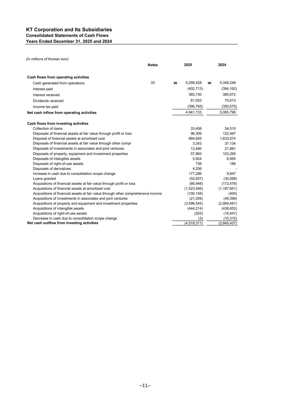 KT Corporation and Its Subsidiaries Consolidated Statements of Cash Flows Years Ended December 31, 2025 and 2024 (In millions of Korean won) Notes Cash flows from operating activities Cash generated from operations 33 ₩ 5,299,428 ₩ 5,349,248 Interest paid (402,713) (394,162) Interest received 360,730 385,672 Dividends received 81,053 75,613 Income tax paid (396,765) (350,575) Net cash inflow from operating activities 4,941,733 5,065,796 Cash flows from investing activities Collection of loans 33,406 34,510 Disposals of financial assets at fair value through profit or loss 96,309 122,497 Disposal of financial assets at amortized cost 894,655 1,633,074 3,343 37,134 13,480 21,981 Disposals of property, equipment and investment properties 57,893 103,295 Disposals of intangible assets 5,924 6,955 Disposals of right-of-use assets 736 186 Disposals of derivatives 4,256 - Increase in cash due to consolidation scope change 177,286 9,847 Loans granted (52,837) (30,099) Acquisitions of financial assets at fair value through profit or loss (66,948) (172,476) Acquisitions of financial assets at amortized cost (1,523,495) (1,187,651) Acquisitions of financial assets at fair value through other comprehensive income (100,145) (400) Acquisitions of investments in associates and joint ventures (21,209) (49,399) Acquisitions of property and equipment and investment properties (3,596,545) (2,909,481) Acquisitions of intangible assets (444,214) (438,653) Acquisitions of right-of-use assets (203) (16,447) Decrease in cash due to consolidation scope change (3) (10,310) Net cash outflow from investing activities (4,518,311) (2,845,437) 2025 2024 Disposals of financial assets at fair value through other comprehensive income Disposals of investments in associates and joint ventures -11-