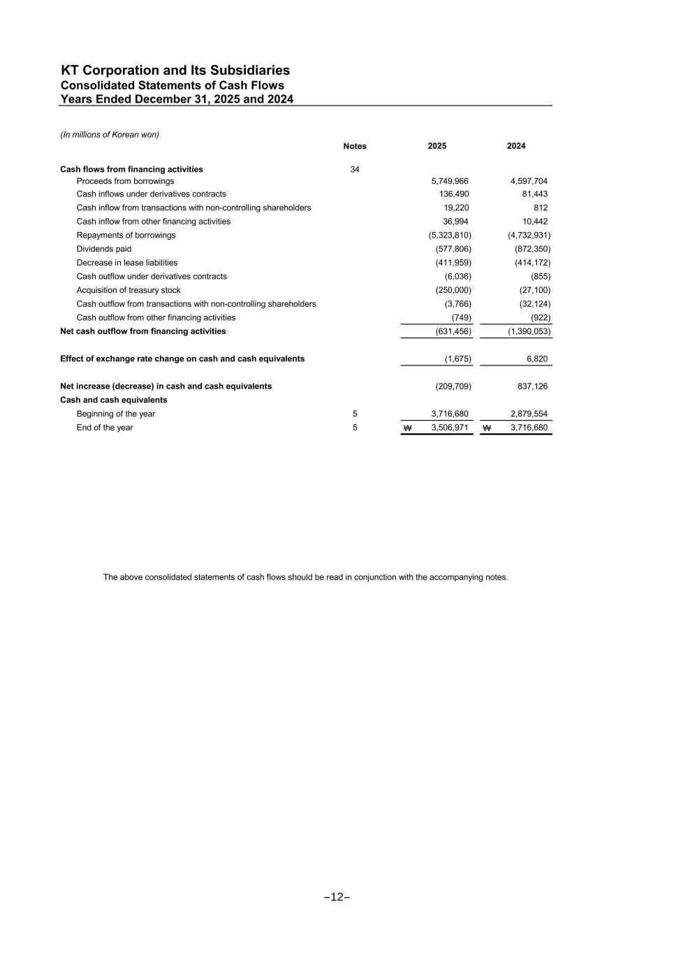 KT Corporation and Its Subsidiaries Consolidated Statements of Cash Flows Years Ended December 31, 2025 and 2024 (In millions of Korean won) Notes Cash flows from financing activities 34 Proceeds from borrowings 5,749,966 4,597,704 Cash inflows under derivatives contracts 136,490 81,443 Cash inflow from transactions with non-controlling shareholders 19,220 812 Cash inflow from other financing activities 36,994 10,442 Repayments of borrowings (5,323,810) (4,732,931) Dividends paid (577,806) (872,350) Decrease in lease liabilities (411,959) (414,172) Cash outflow under derivatives contracts (6,036) (855) Acquisition of treasury stock (250,000) (27,100) Cash outflow from transactions with non-controlling shareholders (3,766) (32,124) Cash outflow from other financing activities (749) (922) Net cash outflow from financing activities (631,456) (1,390,053) Effect of exchange rate change on cash and cash equivalents (1,675) 6,820 Net increase (decrease) in cash and cash equivalents (209,709) 837,126 Cash and cash equivalents Beginning of the year 5 3,716,680 2,879,554 End of the year 5 ₩ 3,506,971 ₩ 3,716,680 The above consolidated statements of cash flows should be read in conjunction with the accompanying notes. 2025 2024 -12-