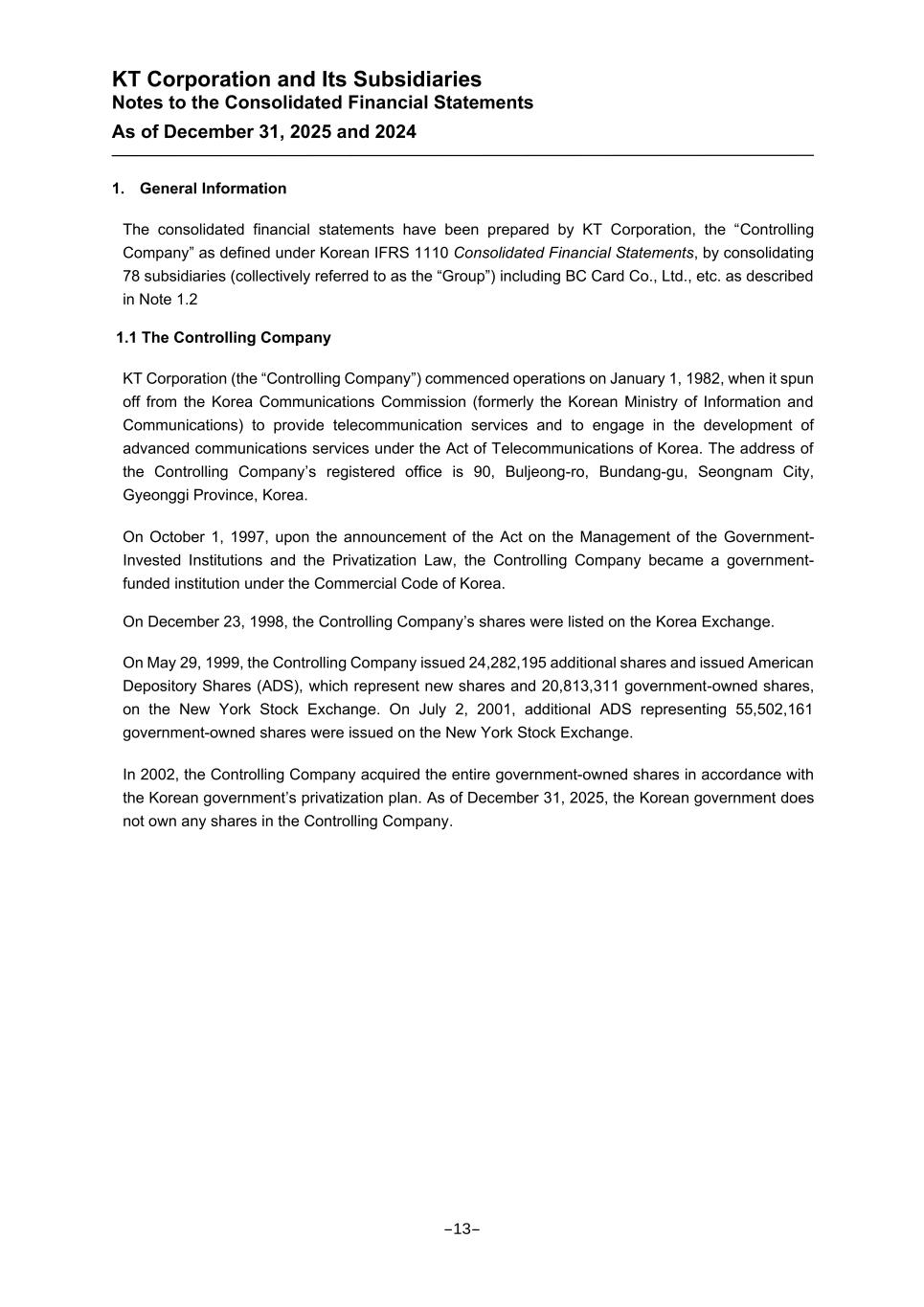 KT Corporation and Its Subsidiaries Notes to the Consolidated Financial Statements As of December 31, 2025 and 2024 1. General Information The consolidated financial statements have been prepared by KT Corporation, the “Controlling Company” as defined under Korean IFRS 1110 Consolidated Financial Statements, by consolidating 78 subsidiaries (collectively referred to as the “Group”) including BC Card Co., Ltd., etc. as described in Note 1.2 1.1 The Controlling Company KT Corporation (the “Controlling Company”) commenced operations on January 1, 1982, when it spun off from the Korea Communications Commission (formerly the Korean Ministry of Information and Communications) to provide telecommunication services and to engage in the development of advanced communications services under the Act of Telecommunications of Korea. The address of the Controlling Company’s registered office is 90, Buljeong-ro, Bundang-gu, Seongnam City, Gyeonggi Province, Korea. On October 1, 1997, upon the announcement of the Act on the Management of the Government- Invested Institutions and the Privatization Law, the Controlling Company became a government- funded institution under the Commercial Code of Korea. On December 23, 1998, the Controlling Company’s shares were listed on the Korea Exchange. On May 29, 1999, the Controlling Company issued 24,282,195 additional shares and issued American Depository Shares (ADS), which represent new shares and 20,813,311 government-owned shares, on the New York Stock Exchange. On July 2, 2001, additional ADS representing 55,502,161 government-owned shares were issued on the New York Stock Exchange. In 2002, the Controlling Company acquired the entire government-owned shares in accordance with the Korean government’s privatization plan. As of December 31, 2025, the Korean government does not own any shares in the Controlling Company. -13-