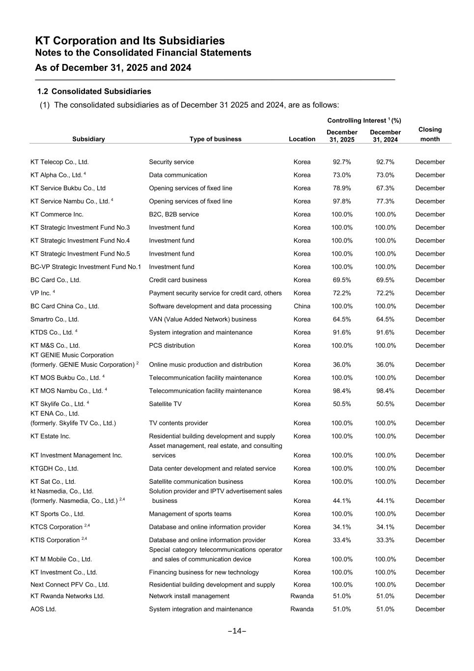KT Corporation and Its Subsidiaries Notes to the Consolidated Financial Statements As of December 31, 2025 and 2024 1.2 Consolidated Subsidiaries (1) The consolidated subsidiaries as of December 31 2025 and 2024, are as follows: Controlling Interest 1 (%) Subsidiary Type of business Location December 31, 2025 December 31, 2024 Closing month KT Telecop Co., Ltd. Security service Korea 92.7% 92.7% December KT Alpha Co., Ltd. 4 Data communication Korea 73.0% 73.0% December KT Service Bukbu Co., Ltd Opening services of fixed line Korea 78.9% 67.3% December KT Service Nambu Co., Ltd. 4 Opening services of fixed line Korea 97.8% 77.3% December KT Commerce Inc. B2C, B2B service Korea 100.0% 100.0% December KT Strategic Investment Fund No.3 Investment fund Korea 100.0% 100.0% December KT Strategic Investment Fund No.4 Investment fund Korea 100.0% 100.0% December KT Strategic Investment Fund No.5 Investment fund Korea 100.0% 100.0% December BC-VP Strategic Investment Fund No.1 Investment fund Korea 100.0% 100.0% December BC Card Co., Ltd. Credit card business Korea 69.5% 69.5% December VP Inc. 4 Payment security service for credit card, others Korea 72.2% 72.2% December BC Card China Co., Ltd. Software development and data processing China 100.0% 100.0% December Smartro Co., Ltd. VAN (Value Added Network) business Korea 64.5% 64.5% December KTDS Co., Ltd. 4 System integration and maintenance Korea 91.6% 91.6% December KT M&S Co., Ltd. PCS distribution Korea 100.0% 100.0% December KT GENIE Music Corporation (formerly. GENIE Music Corporation) 2 Online music production and distribution Korea 36.0% 36.0% December KT MOS Bukbu Co., Ltd. 4 Telecommunication facility maintenance Korea 100.0% 100.0% December KT MOS Nambu Co., Ltd. 4 Telecommunication facility maintenance Korea 98.4% 98.4% December KT Skylife Co., Ltd. 4 Satellite TV Korea 50.5% 50.5% December KT ENA Co., Ltd. (formerly. Skylife TV Co., Ltd.) TV contents provider Korea 100.0% 100.0% December KT Estate Inc. Residential building development and supply Korea 100.0% 100.0% December KT Investment Management Inc. Asset management, real estate, and consulting services Korea 100.0% 100.0% December KTGDH Co., Ltd. Data center development and related service Korea 100.0% 100.0% December KT Sat Co., Ltd. Satellite communication business Korea 100.0% 100.0% December kt Nasmedia, Co., Ltd. (formerly. Nasmedia, Co., Ltd.) 2,4 Solution provider and IPTV advertisement sales business Korea 44.1% 44.1% December KT Sports Co., Ltd. Management of sports teams Korea 100.0% 100.0% December KTCS Corporation 2,4 Database and online information provider Korea 34.1% 34.1% December KTIS Corporation 2,4 Database and online information provider Korea 33.4% 33.3% December KT M Mobile Co., Ltd. Special category telecommunications operator and sales of communication device Korea 100.0% 100.0% December KT Investment Co., Ltd. Financing business for new technology Korea 100.0% 100.0% December Next Connect PFV Co., Ltd. Residential building development and supply Korea 100.0% 100.0% December KT Rwanda Networks Ltd. Network install management Rwanda 51.0% 51.0% December AOS Ltd. System integration and maintenance Rwanda 51.0% 51.0% December -14-