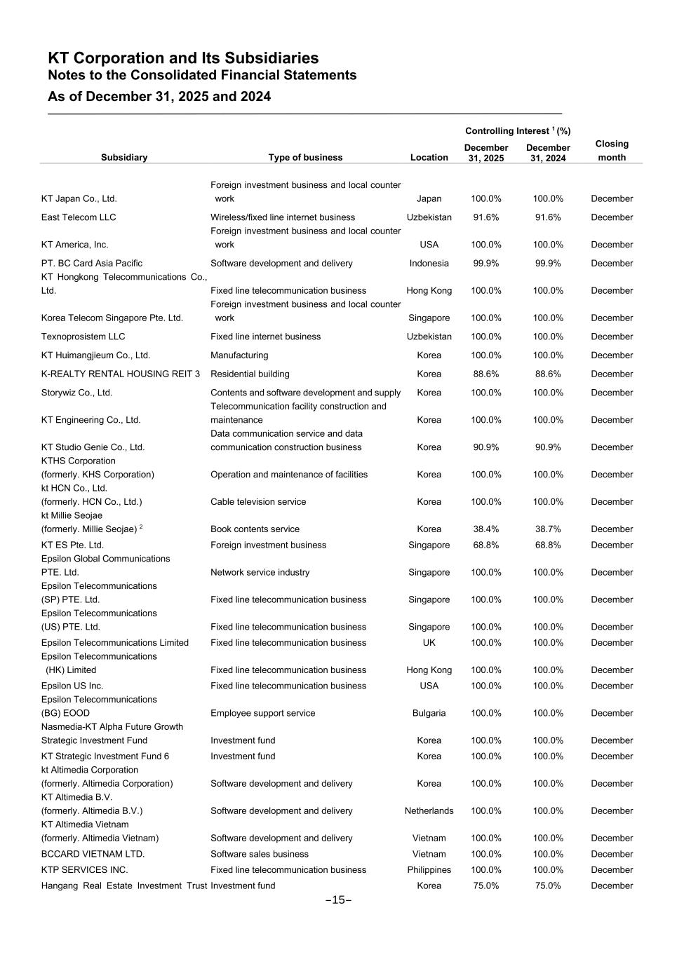 KT Corporation and Its Subsidiaries Notes to the Consolidated Financial Statements As of December 31, 2025 and 2024 Controlling Interest 1 (%) Subsidiary Type of business Location December 31, 2025 December 31, 2024 Closing month KT Japan Co., Ltd. Foreign investment business and local counter work Japan 100.0% 100.0% December East Telecom LLC Wireless/fixed line internet business Uzbekistan 91.6% 91.6% December KT America, Inc. Foreign investment business and local counter work USA 100.0% 100.0% December PT. BC Card Asia Pacific Software development and delivery Indonesia 99.9% 99.9% December KT Hongkong Telecommunications Co., Ltd. Fixed line telecommunication business Hong Kong 100.0% 100.0% December Korea Telecom Singapore Pte. Ltd. Foreign investment business and local counter work Singapore 100.0% 100.0% December Texnoprosistem LLC Fixed line internet business Uzbekistan 100.0% 100.0% December KT Huimangjieum Co., Ltd. Manufacturing Korea 100.0% 100.0% December K-REALTY RENTAL HOUSING REIT 3 Residential building Korea 88.6% 88.6% December Storywiz Co., Ltd. Contents and software development and supply Korea 100.0% 100.0% December KT Engineering Co., Ltd. Telecommunication facility construction and maintenance Korea 100.0% 100.0% December KT Studio Genie Co., Ltd. Data communication service and data communication construction business Korea 90.9% 90.9% December KTHS Corporation (formerly. KHS Corporation) Operation and maintenance of facilities Korea 100.0% 100.0% December kt HCN Co., Ltd. (formerly. HCN Co., Ltd.) Cable television service Korea 100.0% 100.0% December kt Millie Seojae (formerly. Millie Seojae) 2 Book contents service Korea 38.4% 38.7% December KT ES Pte. Ltd. Foreign investment business Singapore 68.8% 68.8% December Epsilon Global Communications PTE. Ltd. Network service industry Singapore 100.0% 100.0% December Epsilon Telecommunications (SP) PTE. Ltd. Fixed line telecommunication business Singapore 100.0% 100.0% December Epsilon Telecommunications (US) PTE. Ltd. Fixed line telecommunication business Singapore 100.0% 100.0% December Epsilon Telecommunications Limited Fixed line telecommunication business UK 100.0% 100.0% December Epsilon Telecommunications (HK) Limited Fixed line telecommunication business Hong Kong 100.0% 100.0% December Epsilon US Inc. Fixed line telecommunication business USA 100.0% 100.0% December Epsilon Telecommunications (BG) EOOD Employee support service Bulgaria 100.0% 100.0% December Nasmedia-KT Alpha Future Growth Strategic Investment Fund Investment fund Korea 100.0% 100.0% December KT Strategic Investment Fund 6 Investment fund Korea 100.0% 100.0% December kt Altimedia Corporation (formerly. Altimedia Corporation) Software development and delivery Korea 100.0% 100.0% December KT Altimedia B.V. (formerly. Altimedia B.V.) Software development and delivery Netherlands 100.0% 100.0% December KT Altimedia Vietnam (formerly. Altimedia Vietnam) Software development and delivery Vietnam 100.0% 100.0% December BCCARD VIETNAM LTD. Software sales business Vietnam 100.0% 100.0% December KTP SERVICES INC. Fixed line telecommunication business Philippines 100.0% 100.0% December Hangang Real Estate Investment Trust Investment fund Korea 75.0% 75.0% December -15-