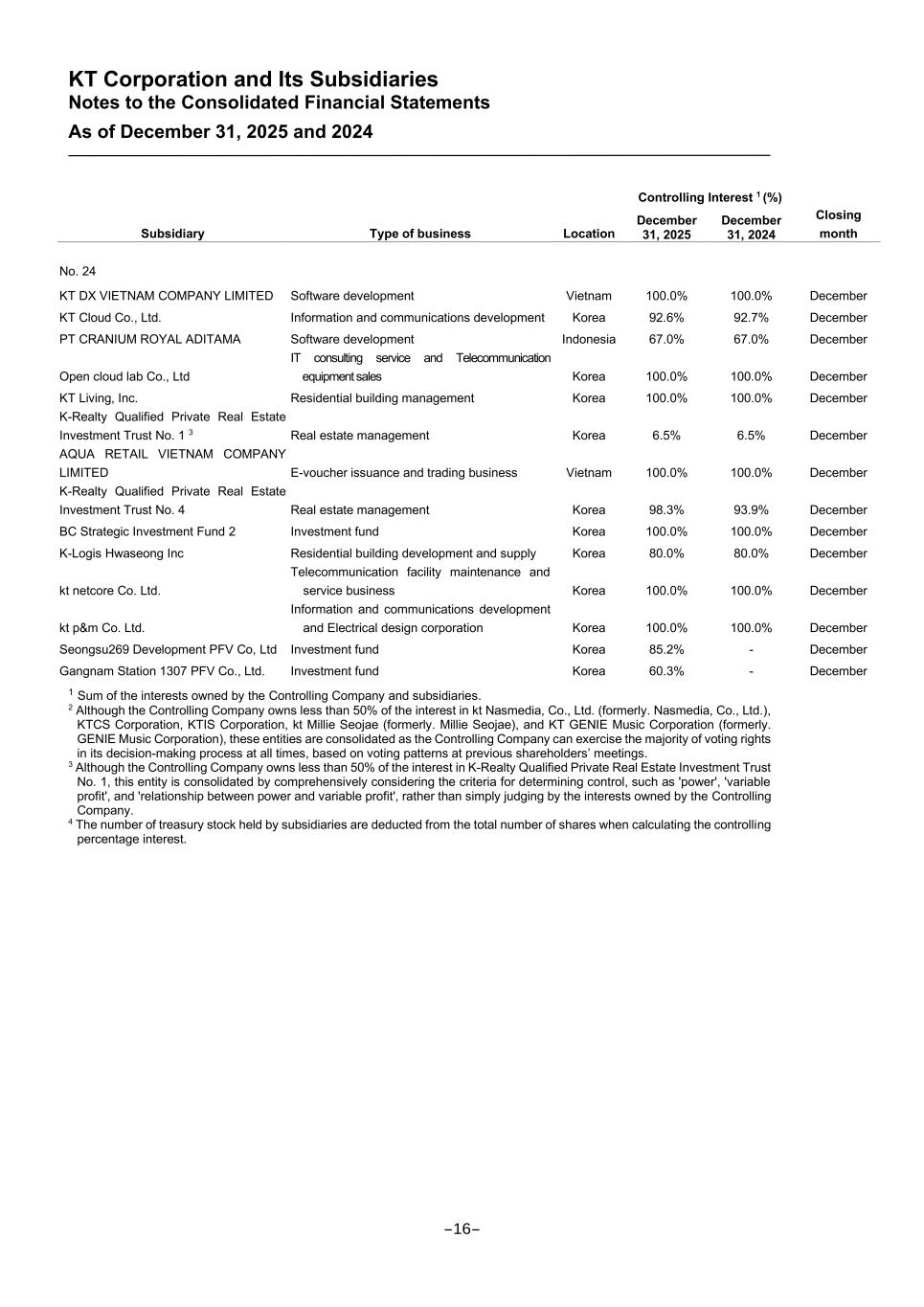 KT Corporation and Its Subsidiaries Notes to the Consolidated Financial Statements As of December 31, 2025 and 2024 Controlling Interest 1 (%) Subsidiary Type of business Location December 31, 2025 December 31, 2024 Closing month No. 24 KT DX VIETNAM COMPANY LIMITED Software development Vietnam 100.0% 100.0% December KT Cloud Co., Ltd. Information and communications development Korea 92.6% 92.7% December PT CRANIUM ROYAL ADITAMA Software development Indonesia 67.0% 67.0% December Open cloud lab Co., Ltd IT consulting service and Telecommunication equipment sales Korea 100.0% 100.0% December KT Living, Inc. Residential building management Korea 100.0% 100.0% December K-Realty Qualified Private Real Estate Investment Trust No. 1 3 Real estate management Korea 6.5% 6.5% December AQUA RETAIL VIETNAM COMPANY LIMITED E-voucher issuance and trading business Vietnam 100.0% 100.0% December K-Realty Qualified Private Real Estate Investment Trust No. 4 Real estate management Korea 98.3% 93.9% December BC Strategic Investment Fund 2 Investment fund Korea 100.0% 100.0% December K-Logis Hwaseong Inc Residential building development and supply Korea 80.0% 80.0% December kt netcore Co. Ltd. Telecommunication facility maintenance and service business Korea 100.0% 100.0% December kt p&m Co. Ltd. Information and communications development and Electrical design corporation Korea 100.0% 100.0% December Seongsu269 Development PFV Co, Ltd Investment fund Korea 85.2% - December Gangnam Station 1307 PFV Co., Ltd. Investment fund Korea 60.3% - December 1 Sum of the interests owned by the Controlling Company and subsidiaries. 2 Although the Controlling Company owns less than 50% of the interest in kt Nasmedia, Co., Ltd. (formerly. Nasmedia, Co., Ltd.), KTCS Corporation, KTIS Corporation, kt Millie Seojae (formerly. Millie Seojae), and KT GENIE Music Corporation (formerly. GENIE Music Corporation), these entities are consolidated as the Controlling Company can exercise the majority of voting rights in its decision-making process at all times, based on voting patterns at previous shareholders’ meetings. 3 Although the Controlling Company owns less than 50% of the interest in K-Realty Qualified Private Real Estate Investment Trust No. 1, this entity is consolidated by comprehensively considering the criteria for determining control, such as 'power', 'variable profit', and 'relationship between power and variable profit', rather than simply judging by the interests owned by the Controlling Company. 4 The number of treasury stock held by subsidiaries are deducted from the total number of shares when calculating the controlling percentage interest. -16-