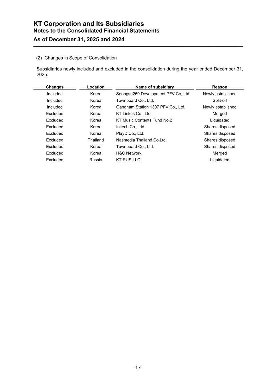 KT Corporation and Its Subsidiaries Notes to the Consolidated Financial Statements As of December 31, 2025 and 2024 (2) Changes in Scope of Consolidation Subsidiaries newly included and excluded in the consolidation during the year ended December 31, 2025: Changes Location Name of subsidiary Reason Included Korea Seongsu269 Development PFV Co, Ltd Newly established Included Korea Townboard Co., Ltd. Split-off Included Korea Gangnam Station 1307 PFV Co., Ltd. Newly established Excluded Korea KT Linkus Co., Ltd. Merged Excluded Korea KT Music Contents Fund No.2 Liquidated Excluded Korea Initech Co., Ltd. Shares disposed Excluded Korea PlayD Co., Ltd. Shares disposed Excluded Thailand Nasmedia Thailand Co.Ltd. Shares disposed Excluded Korea Townboard Co., Ltd. Shares disposed Excluded Korea H&C Network Merged Excluded Russia KT RUS LLC Liquidated -17-