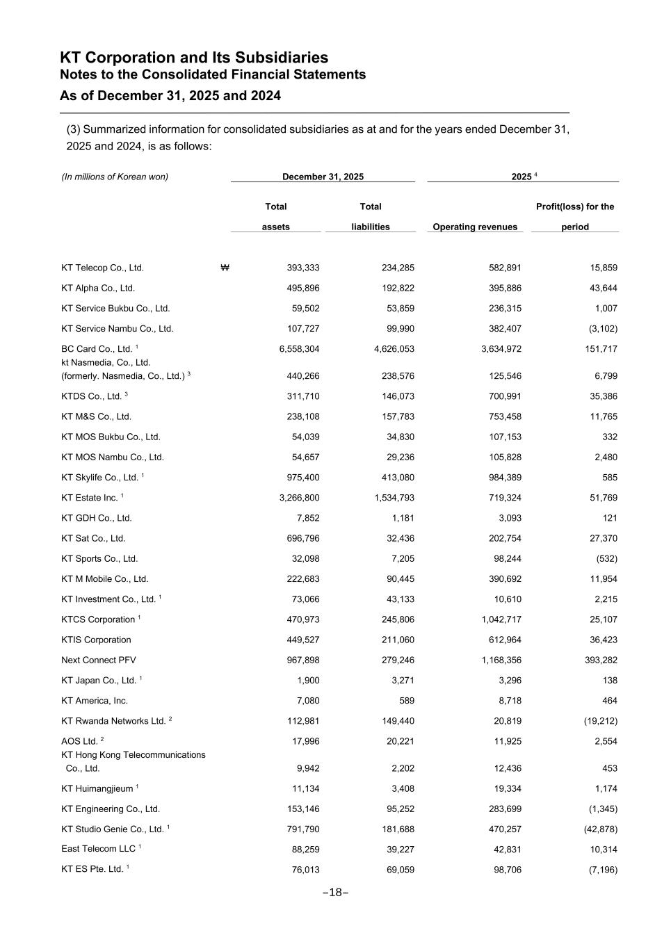 KT Corporation and Its Subsidiaries Notes to the Consolidated Financial Statements As of December 31, 2025 and 2024 (3) Summarized information for consolidated subsidiaries as at and for the years ended December 31, 2025 and 2024, is as follows: (In millions of Korean won) December 31, 2025 2025 4 Total assets Total liabilities Operating revenues Profit(loss) for the period KT Telecop Co., Ltd. ₩ 393,333 234,285 582,891 15,859 KT Alpha Co., Ltd. 495,896 192,822 395,886 43,644 KT Service Bukbu Co., Ltd. 59,502 53,859 236,315 1,007 KT Service Nambu Co., Ltd. 107,727 99,990 382,407 (3,102) BC Card Co., Ltd. 1 6,558,304 4,626,053 3,634,972 151,717 kt Nasmedia, Co., Ltd. (formerly. Nasmedia, Co., Ltd.) 3 440,266 238,576 125,546 6,799 KTDS Co., Ltd. 3 311,710 146,073 700,991 35,386 KT M&S Co., Ltd. 238,108 157,783 753,458 11,765 KT MOS Bukbu Co., Ltd. 54,039 34,830 107,153 332 KT MOS Nambu Co., Ltd. 54,657 29,236 105,828 2,480 KT Skylife Co., Ltd. 1 975,400 413,080 984,389 585 KT Estate Inc. 1 3,266,800 1,534,793 719,324 51,769 KT GDH Co., Ltd. 7,852 1,181 3,093 121 KT Sat Co., Ltd. 696,796 32,436 202,754 27,370 KT Sports Co., Ltd. 32,098 7,205 98,244 (532) KT M Mobile Co., Ltd. 222,683 90,445 390,692 11,954 KT Investment Co., Ltd. 1 73,066 43,133 10,610 2,215 KTCS Corporation 1 470,973 245,806 1,042,717 25,107 KTIS Corporation 449,527 211,060 612,964 36,423 Next Connect PFV 967,898 279,246 1,168,356 393,282 KT Japan Co., Ltd. 1 1,900 3,271 3,296 138 KT America, Inc. 7,080 589 8,718 464 KT Rwanda Networks Ltd. 2 112,981 149,440 20,819 (19,212) AOS Ltd. 2 17,996 20,221 11,925 2,554 KT Hong Kong Telecommunications Co., Ltd. 9,942 2,202 12,436 453 KT Huimangjieum 1 11,134 3,408 19,334 1,174 KT Engineering Co., Ltd. 153,146 95,252 283,699 (1,345) KT Studio Genie Co., Ltd. 1 791,790 181,688 470,257 (42,878) East Telecom LLC 1 88,259 39,227 42,831 10,314 KT ES Pte. Ltd. 1 76,013 69,059 98,706 (7,196) -18-