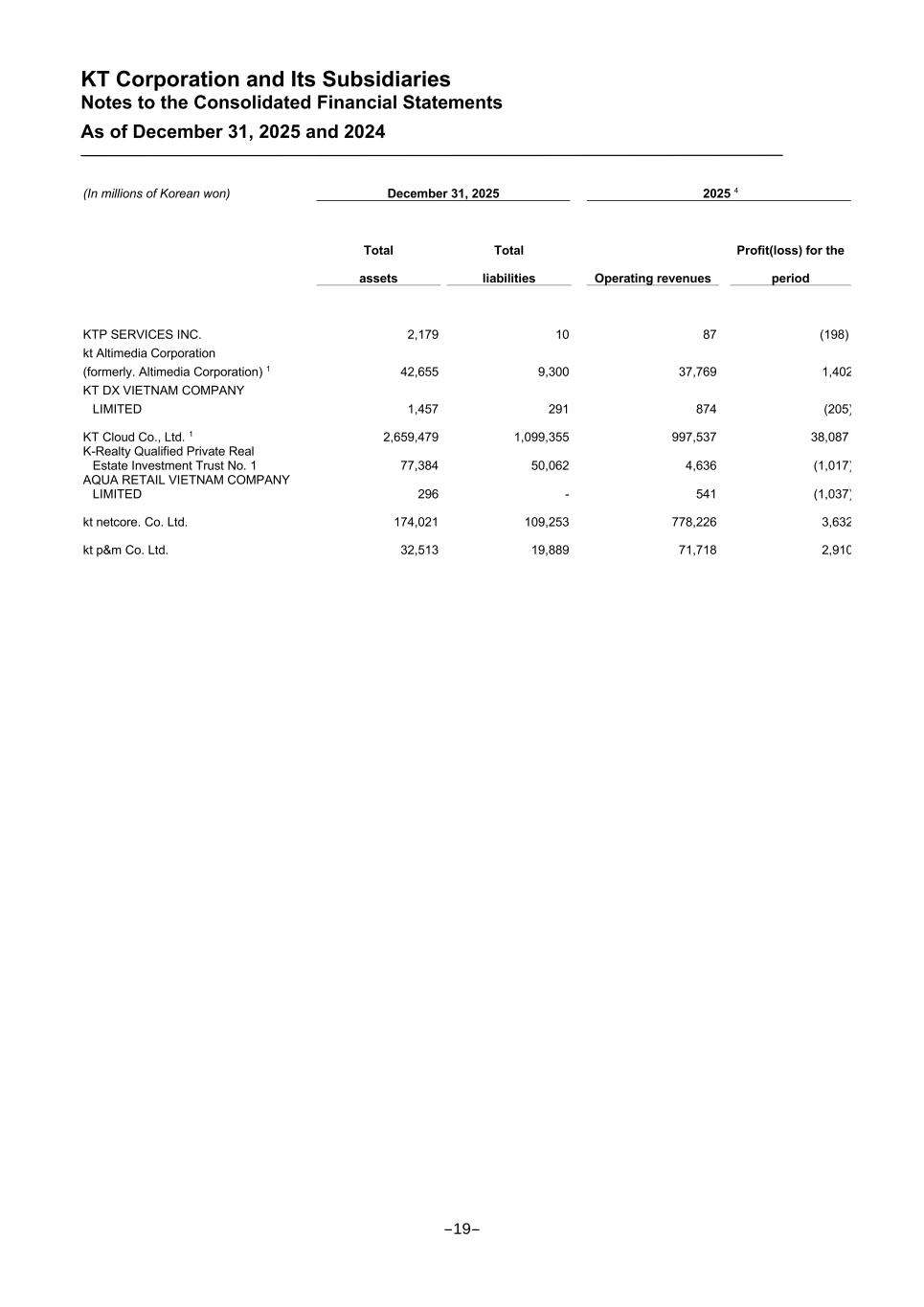 KT Corporation and Its Subsidiaries Notes to the Consolidated Financial Statements As of December 31, 2025 and 2024 (In millions of Korean won) December 31, 2025 2025 4 Total assets Total liabilities Operating revenues Profit(loss) for the period KTP SERVICES INC. 2,179 10 87 (198) kt Altimedia Corporation (formerly. Altimedia Corporation) 1 42,655 9,300 37,769 1,402 KT DX VIETNAM COMPANY LIMITED 1,457 291 874 (205) KT Cloud Co., Ltd. 1 2,659,479 1,099,355 997,537 38,087 K-Realty Qualified Private Real Estate Investment Trust No. 1 77,384 50,062 4,636 (1,017) AQUA RETAIL VIETNAM COMPANY LIMITED 296 - 541 (1,037) kt netcore. Co. Ltd. 174,021 109,253 778,226 3,632 kt p&m Co. Ltd. 32,513 19,889 71,718 2,910 -19-