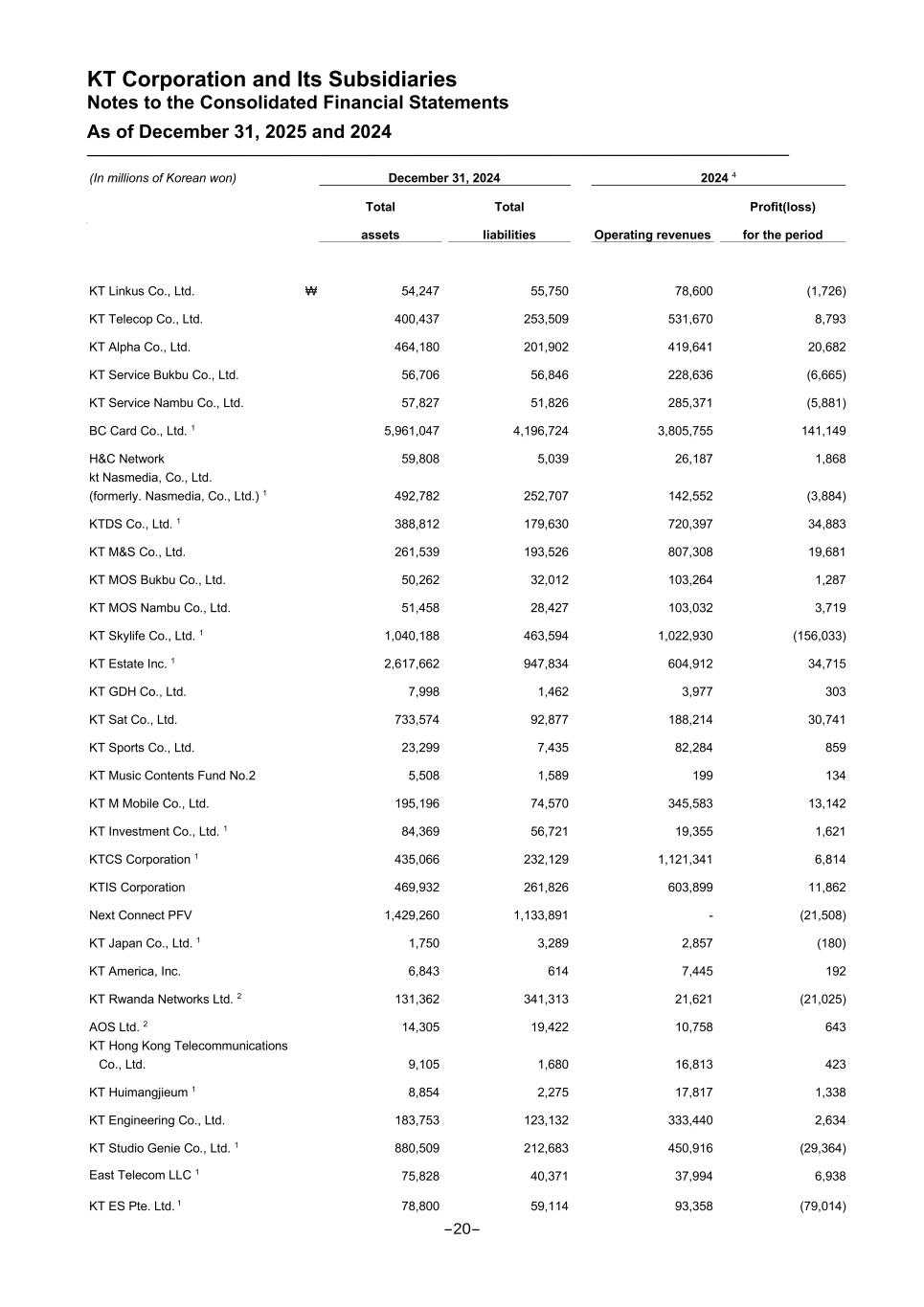 KT Corporation and Its Subsidiaries Notes to the Consolidated Financial Statements As of December 31, 2025 and 2024 (In millions of Korean won) December 31, 2024 2024 4 ss Total assets Total liabilities Operating revenues Profit(loss) for the period KT Linkus Co., Ltd. ₩ 54,247 55,750 78,600 (1,726) KT Telecop Co., Ltd. 400,437 253,509 531,670 8,793 KT Alpha Co., Ltd. 464,180 201,902 419,641 20,682 KT Service Bukbu Co., Ltd. 56,706 56,846 228,636 (6,665) KT Service Nambu Co., Ltd. 57,827 51,826 285,371 (5,881) BC Card Co., Ltd. 1 5,961,047 4,196,724 3,805,755 141,149 H&C Network 59,808 5,039 26,187 1,868 kt Nasmedia, Co., Ltd. (formerly. Nasmedia, Co., Ltd.) 1 492,782 252,707 142,552 (3,884) KTDS Co., Ltd. 1 388,812 179,630 720,397 34,883 KT M&S Co., Ltd. 261,539 193,526 807,308 19,681 KT MOS Bukbu Co., Ltd. 50,262 32,012 103,264 1,287 KT MOS Nambu Co., Ltd. 51,458 28,427 103,032 3,719 KT Skylife Co., Ltd. 1 1,040,188 463,594 1,022,930 (156,033) KT Estate Inc. 1 2,617,662 947,834 604,912 34,715 KT GDH Co., Ltd. 7,998 1,462 3,977 303 KT Sat Co., Ltd. 733,574 92,877 188,214 30,741 KT Sports Co., Ltd. 23,299 7,435 82,284 859 KT Music Contents Fund No.2 5,508 1,589 199 134 KT M Mobile Co., Ltd. 195,196 74,570 345,583 13,142 KT Investment Co., Ltd. 1 84,369 56,721 19,355 1,621 KTCS Corporation 1 435,066 232,129 1,121,341 6,814 KTIS Corporation 469,932 261,826 603,899 11,862 Next Connect PFV 1,429,260 1,133,891 - (21,508) KT Japan Co., Ltd. 1 1,750 3,289 2,857 (180) KT America, Inc. 6,843 614 7,445 192 KT Rwanda Networks Ltd. 2 131,362 341,313 21,621 (21,025) AOS Ltd. 2 14,305 19,422 10,758 643 KT Hong Kong Telecommunications Co., Ltd. 9,105 1,680 16,813 423 KT Huimangjieum 1 8,854 2,275 17,817 1,338 KT Engineering Co., Ltd. 183,753 123,132 333,440 2,634 KT Studio Genie Co., Ltd. 1 880,509 212,683 450,916 (29,364) East Telecom LLC 1 75,828 40,371 37,994 6,938 KT ES Pte. Ltd. 1 78,800 59,114 93,358 (79,014) -20-
