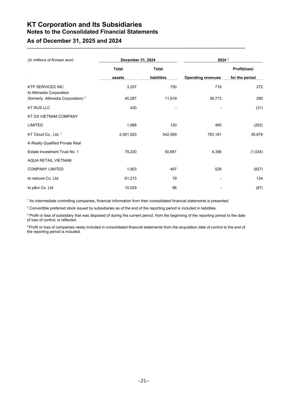 KT Corporation and Its Subsidiaries Notes to the Consolidated Financial Statements As of December 31, 2025 and 2024 (In millions of Korean won) December 31, 2024 2024 4 ss Total assets Total liabilities Operating revenues Profit(loss) for the period KTP SERVICES INC. 3,257 750 718 272 kt Altimedia Corporation (formerly. Altimedia Corporation) 1 45,287 11,919 36,773 290 KT RUS LLC 420 - - (31) KT DX VIETNAM COMPANY LIMITED 1,568 120 465 (262) KT Cloud Co., Ltd. 1 2,061,020 542,569 783,181 35,676 K-Realty Qualified Private Real Estate Investment Trust No. 1 79,220 50,681 4,356 (1,034) AQUA RETAIL VIETNAM COMPANY LIMITED 1,903 497 528 (827) kt netcore Co. Ltd. 61,213 79 - 134 kt p&m Co. Ltd 10,029 96 - (67) 1 As intermediate controlling companies, financial information from their consolidated financial statements is presented. 2 Convertible preferred stock issued by subsidiaries as of the end of the reporting period is included in liabilities. 3 Profit or loss of subsidiary that was disposed of during the current period, from the beginning of the reporting period to the date of loss of control, is reflected. 4 Profit or loss of companies newly included in consolidated financial statements from the acquisition date of control to the end of the reporting period is included. -21-