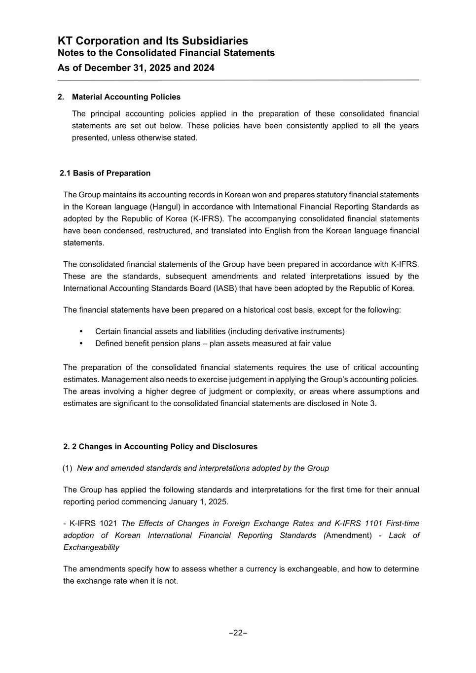 KT Corporation and Its Subsidiaries Notes to the Consolidated Financial Statements As of December 31, 2025 and 2024 2. Material Accounting Policies The principal accounting policies applied in the preparation of these consolidated financial statements are set out below. These policies have been consistently applied to all the years presented, unless otherwise stated. 2.1 Basis of Preparation The Group maintains its accounting records in Korean won and prepares statutory financial statements in the Korean language (Hangul) in accordance with International Financial Reporting Standards as adopted by the Republic of Korea (K-IFRS). The accompanying consolidated financial statements have been condensed, restructured, and translated into English from the Korean language financial statements. The consolidated financial statements of the Group have been prepared in accordance with K-IFRS. These are the standards, subsequent amendments and related interpretations issued by the International Accounting Standards Board (IASB) that have been adopted by the Republic of Korea. The financial statements have been prepared on a historical cost basis, except for the following: Certain financial assets and liabilities (including derivative instruments) Defined benefit pension plans – plan assets measured at fair value The preparation of the consolidated financial statements requires the use of critical accounting estimates. Management also needs to exercise judgement in applying the Group’s accounting policies. The areas involving a higher degree of judgment or complexity, or areas where assumptions and estimates are significant to the consolidated financial statements are disclosed in Note 3. 2. 2 Changes in Accounting Policy and Disclosures (1) New and amended standards and interpretations adopted by the Group The Group has applied the following standards and interpretations for the first time for their annual reporting period commencing January 1, 2025. - K-IFRS 1021 The Effects of Changes in Foreign Exchange Rates and K-IFRS 1101 First-time adoption of Korean International Financial Reporting Standards (Amendment) - Lack of Exchangeability The amendments specify how to assess whether a currency is exchangeable, and how to determine the exchange rate when it is not. -22-